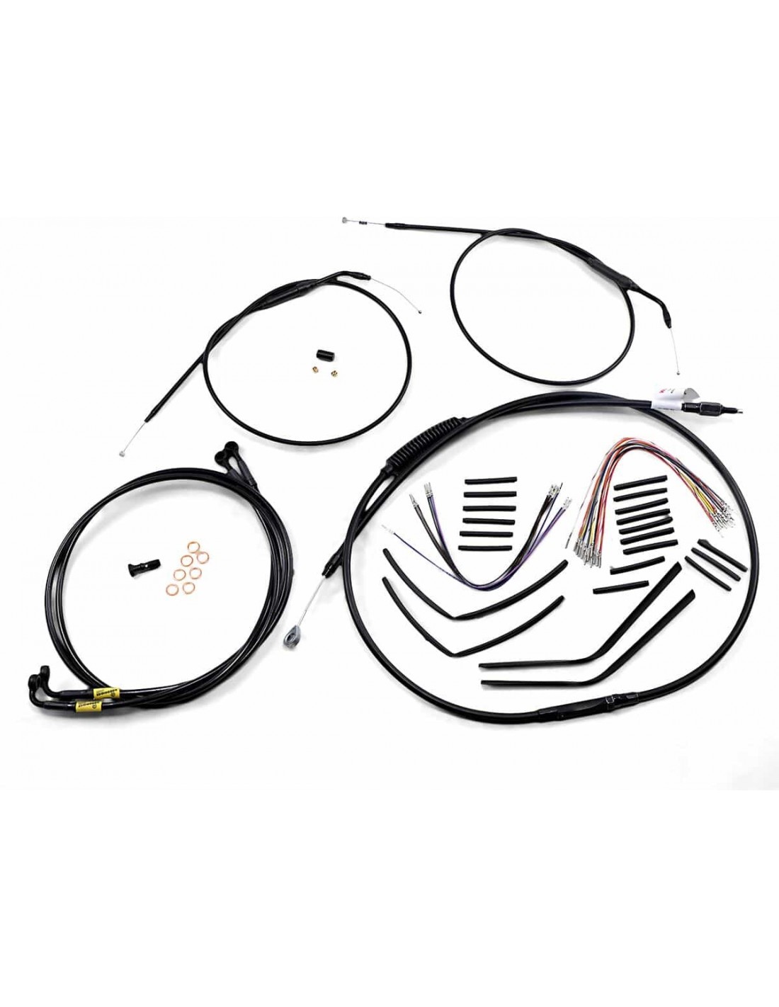 Burly BrandKit tubo/cavo manubrio completo in vinile per manubri Ape HangerKit di installazione completo per Burly Ape Hanger I kit includono tubo freno prolungato, cavo/tubo frizione prolungato , cavi comando gas di andata/ritorno prolungati come richiesto e tutto il cablaggio necessario I tubi freno, se inclusi, presentano un rivestimento interno in PTFE e una treccia esterna in acciaio inossidabile resistente I kit Dresser riutilizzano il cablaggio Ride-By-Wire di serie I kit si basano sull'utilizzo di rialzi da 2” con manubri in stile Ape Hanger