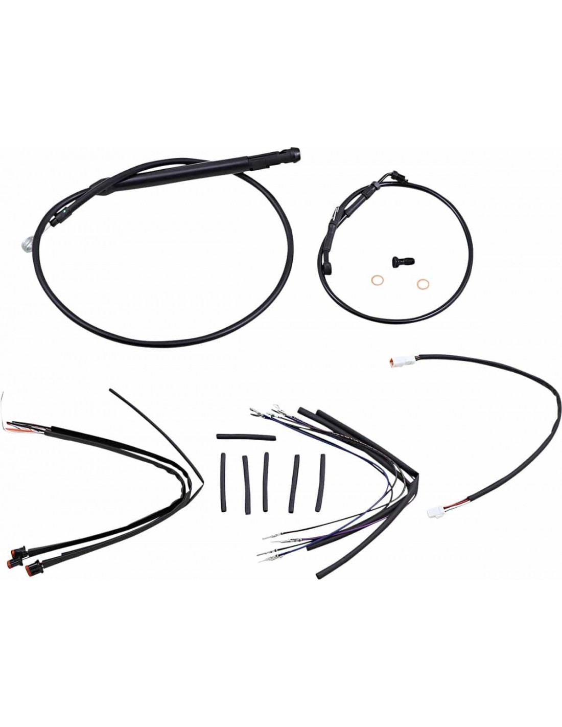 Burly BrandKit tubo/cavo manubrio completo in vinile per manubri Ape HangerKit di installazione completo per Burly Ape Hanger I kit includono tubo freno prolungato, cavo/tubo frizione prolungato , cavi comando gas di andata/ritorno prolungati come richiesto e tutto il cablaggio necessario I tubi freno, se inclusi, presentano un rivestimento interno in PTFE e una treccia esterna in acciaio inossidabile resistente I kit Dresser riutilizzano il cablaggio Ride-By-Wire di serie I kit si basano sull'utilizzo di rialzi da 2” con manubri in stile Ape Hanger