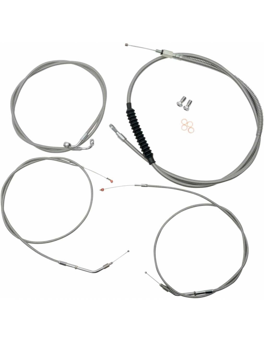 La ChoppersKit tubo freno/cavo manubrio intrecciato in acciaio inossidabile standardCon questo prodotto il calcolo dei cavi non rappresenterà più un problema Il kit standard include tubi freno/frizione della lunghezza corretta e prolunghe cavo per completare la sostituzione di un manubrio; prolunghe cavo elettrico non incluse (disponibili separatamente) Il kit standard include tubo frizione, tubi freno, giunto a T cromato per tubo freno, viti banjo, raccordi e rondelle di tenuta in rame Made in the USA Il kit si basa sull'utilizzo di riser da 2” con manubri Ape Hanger
