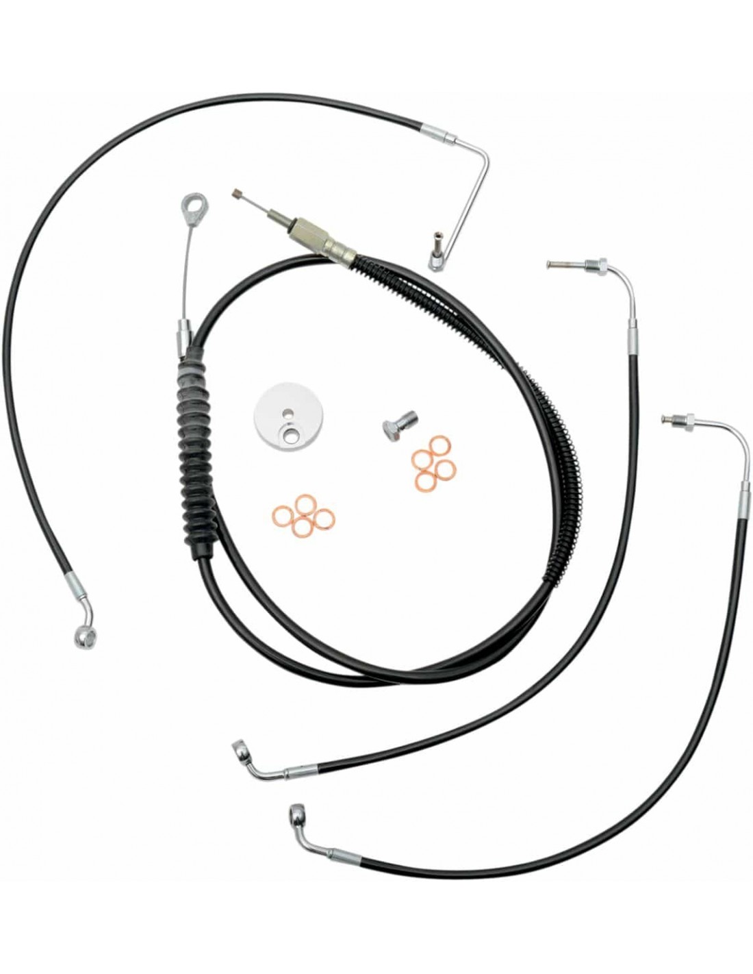 La ChoppersKit tubo freno/cavo manubrio intrecciato standard in vinile neroIl kit standard include tubo frizione, tubi freno, giunto a T cromato per tubo freno, viti banjo, raccordi e rondelle di tenuta in rame Tubi freno/frizione della lunghezza corretta e prolunghe inclusi per completare la sostituzione di un manubrio Made in the USA Prolunghe fili elettrici non inclusi (disponibili separatamente ) Il kit si basa sull'utilizzo di riser da 2” con manubri Ape Hanger