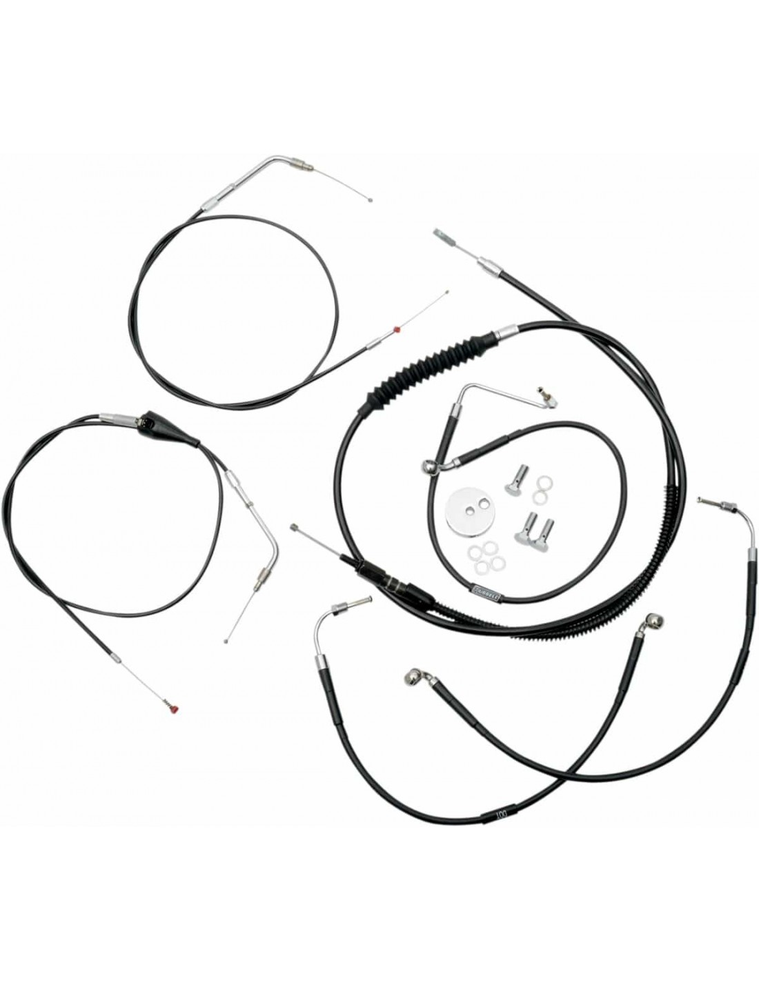 La ChoppersKit tubo freno/cavo manubrio intrecciato standard in vinile neroIl kit standard include tubo frizione, tubi freno, giunto a T cromato per tubo freno, viti banjo, raccordi e rondelle di tenuta in rame Tubi freno/frizione della lunghezza corretta e prolunghe inclusi per completare la sostituzione di un manubrio Made in the USA Prolunghe fili elettrici non inclusi (disponibili separatamente ) Il kit si basa sull'utilizzo di riser da 2” con manubri Ape Hanger