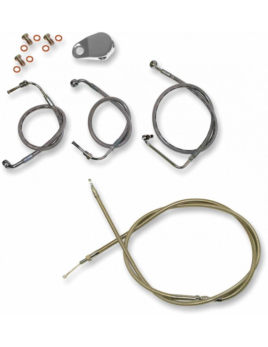 La ChoppersKit tubo freno/cavo manubrio intrecciato in acciaio inossidabile standardCon questo prodotto il calcolo dei cavi non rappresenterà più un problema Il kit standard include tubi freno/frizione della lunghezza corretta e prolunghe cavo per completare la sostituzione di un manubrio; prolunghe cavo elettrico non incluse (disponibili separatamente) Il kit standard include tubo frizione, tubi freno, giunto a T cromato per tubo freno, viti banjo, raccordi e rondelle di tenuta in rame Made in the USA Il kit si basa sull'utilizzo di riser da 2” con manubri Ape Hanger