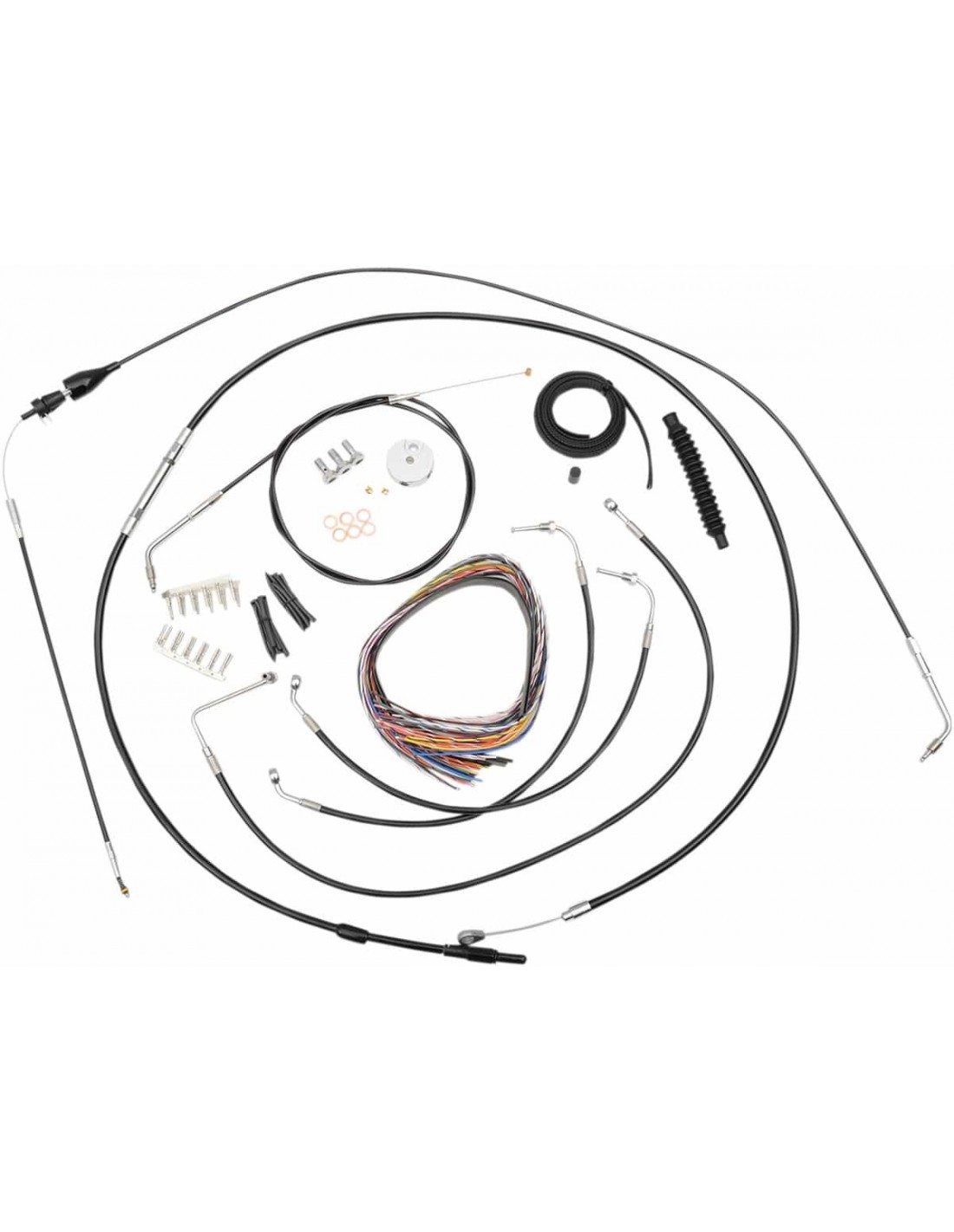 La ChoppersKit tubo freno/cavo manubrio completo intrecciato in vinile neroIl kit completo include tubi freno/frizione intrecciati della lunghezza corretta e prolunghe cavo per completare la sostituzione di un manubrio Il kit include giunto tubo freno a “T” cromato, viti banjo, raccordi e rondelle di tenuta in rame Made in USA Il kit si basa sull'utilizzo di riser da 2” con manubrio Ape Hanger