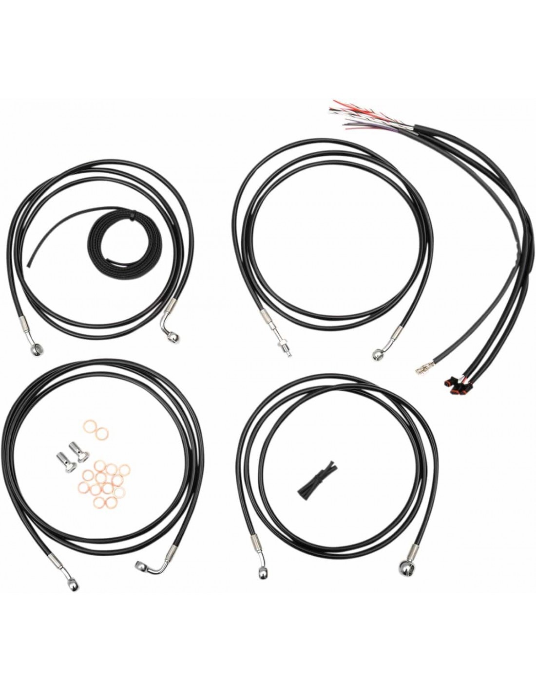 La ChoppersKit tubo freno/cavo manubrio completo intrecciato in vinile neroIl kit completo include tubi freno/frizione intrecciati della lunghezza corretta e prolunghe cavo per completare la sostituzione di un manubrio Il kit include giunto tubo freno a “T” cromato, viti banjo, raccordi e rondelle di tenuta in rame Made in USA Il kit si basa sull'utilizzo di riser da 2” con manubrio Ape Hanger