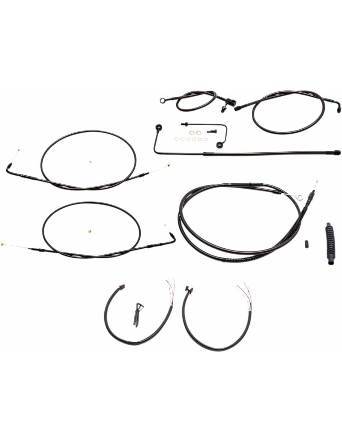 La ChoppersKit tubo freno/cavo manubrio completo intrecciato MidnightIl kit include tubi freno/frizione intrecciati della lunghezza corretta e prolunghe cavo per completare la sostituzione di un manubrio Il kit include giunto tubo freno a “T” nero, viti banjo, raccordi e rondelle di tenuta in rame Made in the USA Il kit si basa sull'utilizzo di riser da 2” con manubri Ape Hanger