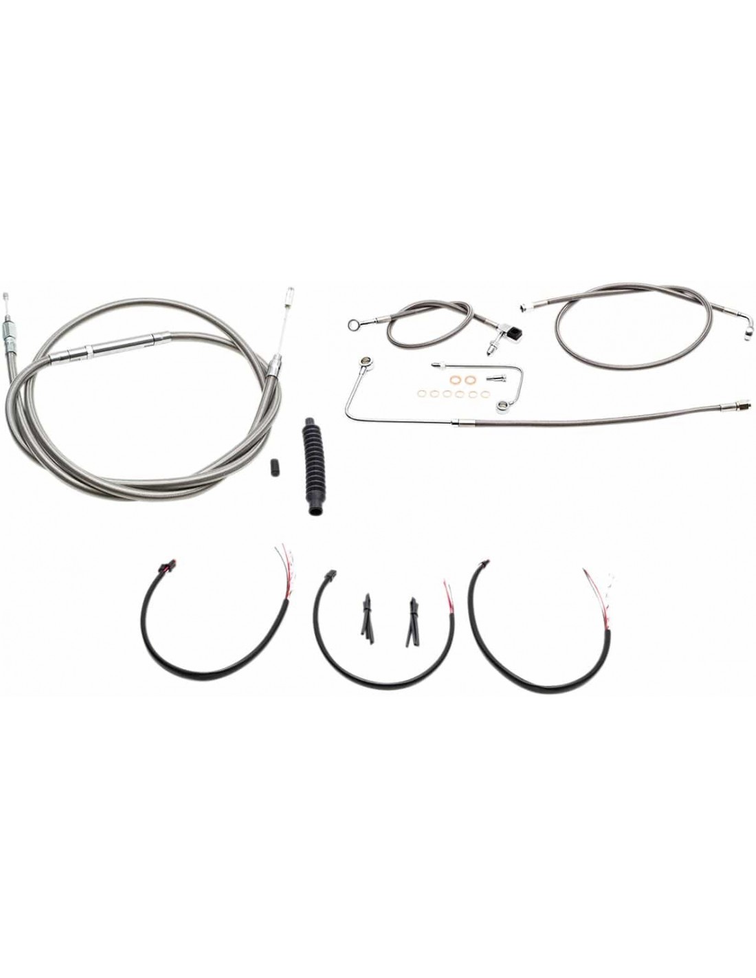 La ChoppersKit tubo freno/cavo manubrio intrecciato in acciaio inossidabile completoCon questo prodotto il “calcolo dei cavi” non rappresenterà più un problema Il kit include cavi della lunghezza corretta , tubi freno e prolunghe cavo per completare la sostituzione di un manubrio Il kit in acciaio inossidabile intrecciato include cavo andata gas, cavo ritorno gas (salvo diversamente indicato), cavo frizione, tubi freno, giunto a T cromato per tubo freno, viti banjo, raccordi e rondelle di tenuta in rame Made in the USA Il kit si basa sull'utilizzo di riser da 2” con manubri Ape Hanger li>