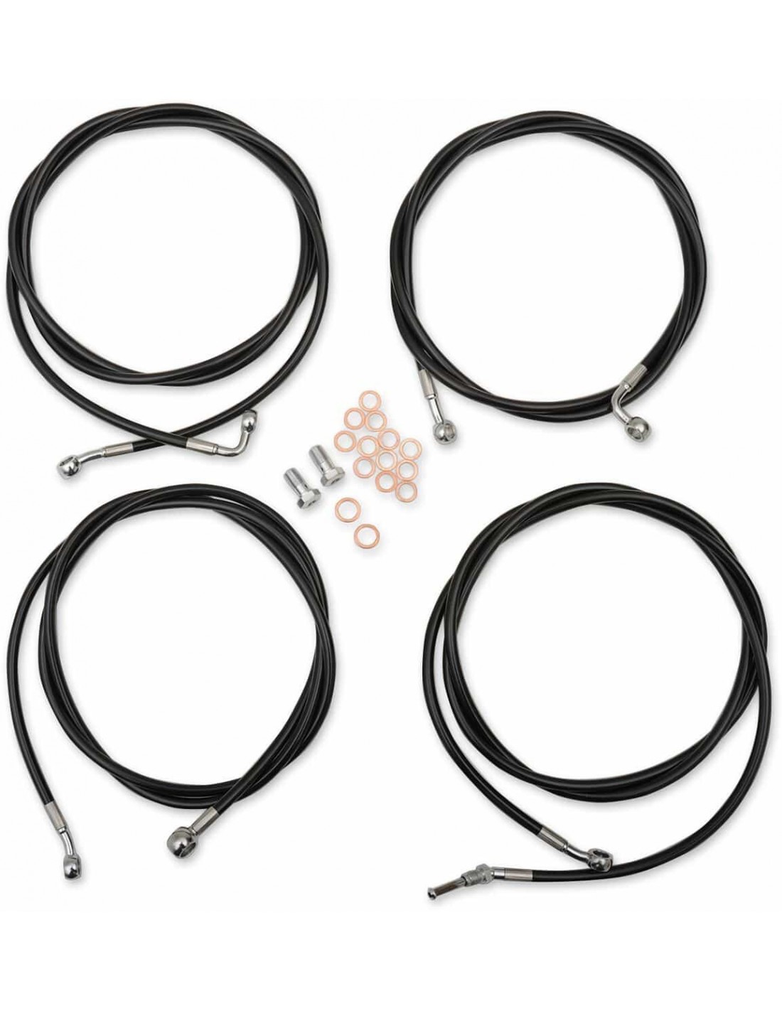La ChoppersKit tubo freno/cavo manubrio intrecciato standard in vinile neroIl kit standard include tubo frizione, tubi freno, giunto a T cromato per tubo freno, viti banjo, raccordi e rondelle di tenuta in rame Tubi freno/frizione della lunghezza corretta e prolunghe inclusi per completare la sostituzione di un manubrio Made in the USA Prolunghe fili elettrici non inclusi (disponibili separatamente ) Il kit si basa sull'utilizzo di riser da 2” con manubri Ape Hanger