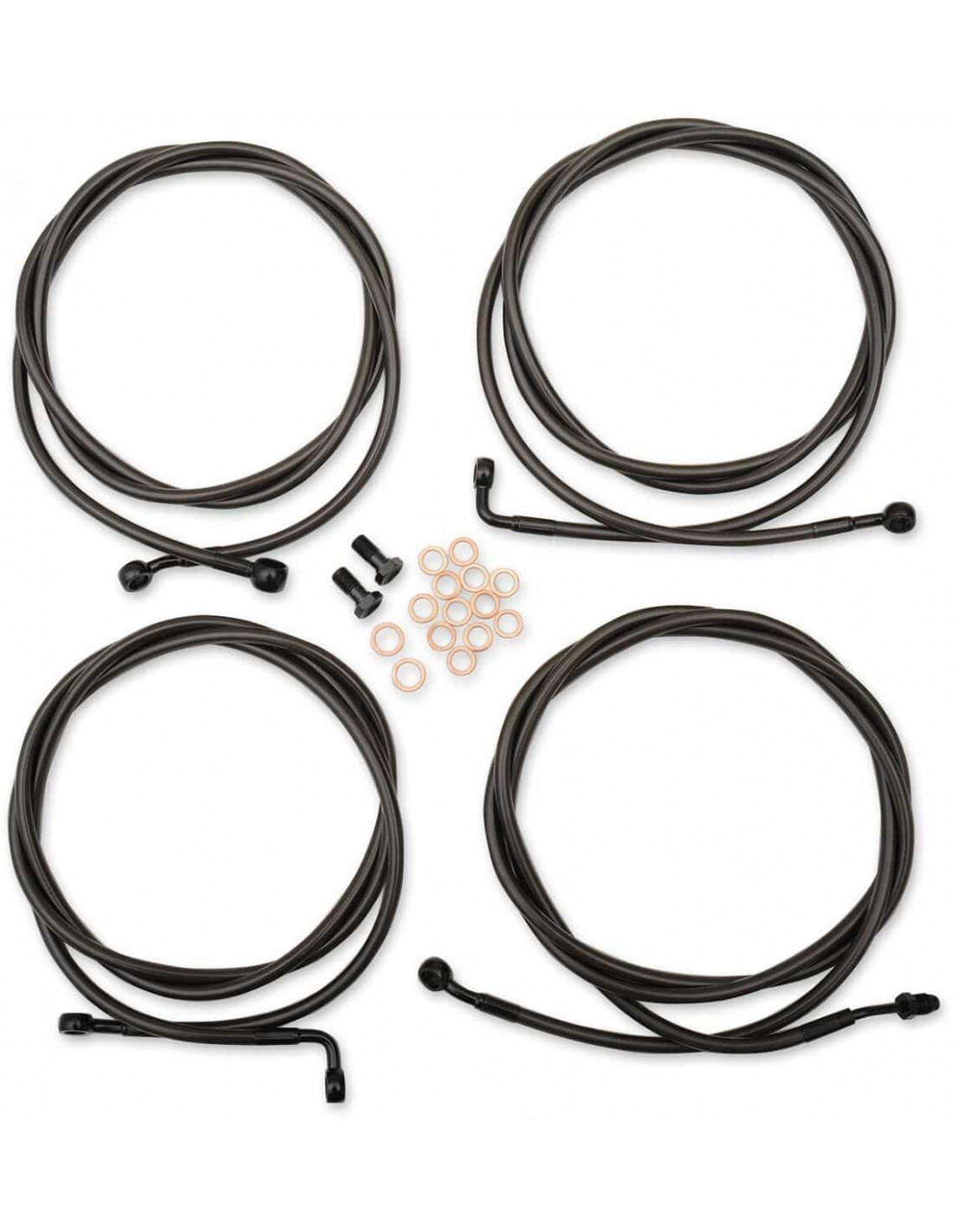 Kit tubo freno/cavo manubrio intrecciato standard MidnightI kit standard includono tubo frizione, tubi freno, giunto tubo freno a “T” nero, viti banjo, raccordi e rondelle di tenuta in rame< /li> I kit standard includono i tubi freno/frizione della lunghezza corretta e prolunghe di filo per completare la sostituzione di un manubrio Prolunghe fili elettrici non inclusi (disponibili separatamente) < li>I kit serie Midnight includono il tubo frizione ei tubi freno ricoperti da un rivestimento nero fumé con raccordi di colore neroI tubi presentano un effetto grafite o fibra di carbonio per un look personalizzato, i raccordi neri si si integrano perfettamente con i comandi e le protezioni di colore nero della moto Made in USA Il kit si basa sull'utilizzo di riser da 2” con manubri Ape Hanger