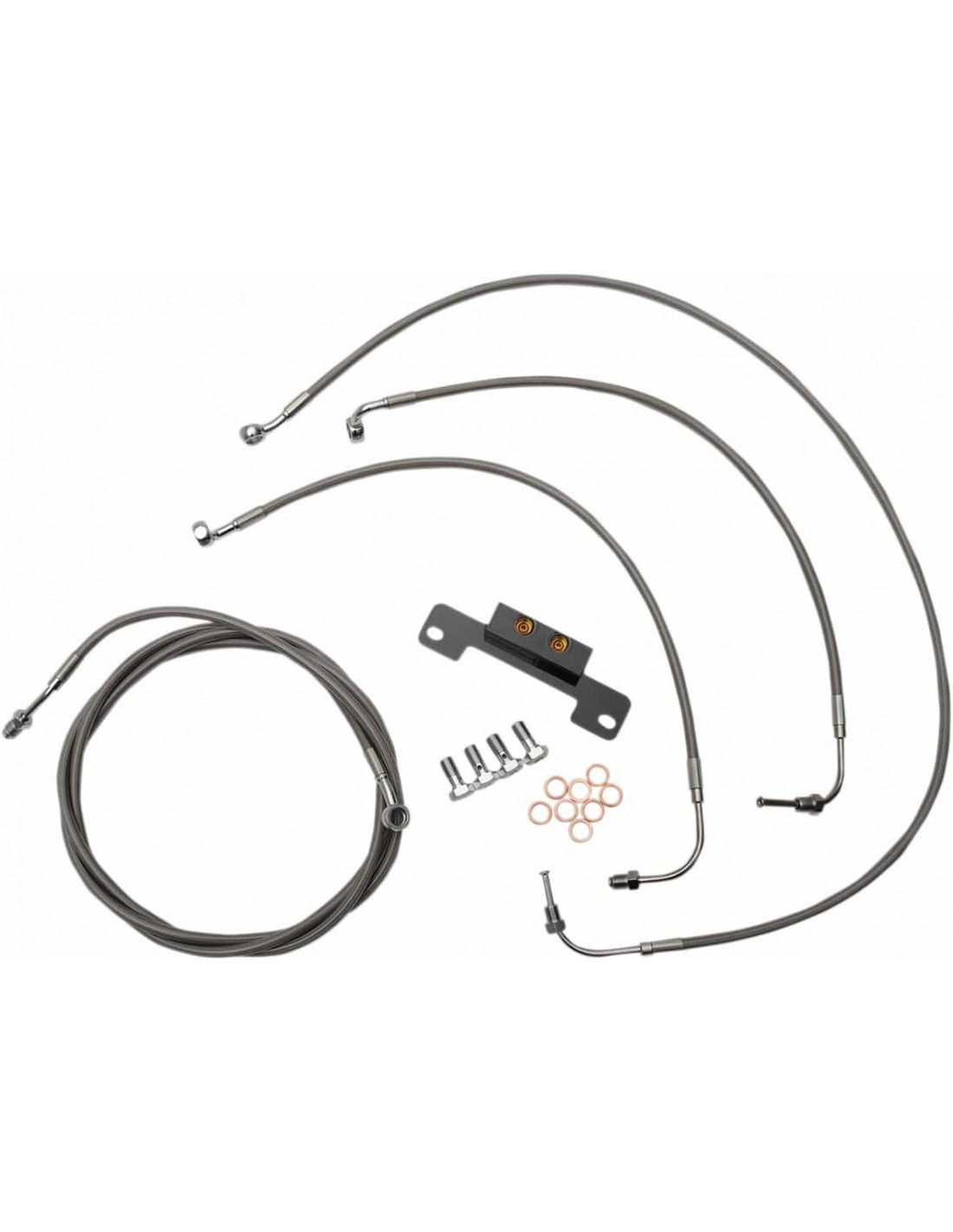 La ChoppersKit tubo freno/cavo manubrio intrecciato in acciaio inossidabile standardCon questo prodotto il calcolo dei cavi non rappresenterà più un problema Il kit standard include tubi freno/frizione della lunghezza corretta e prolunghe cavo per completare la sostituzione di un manubrio; prolunghe cavo elettrico non incluse (disponibili separatamente) Il kit standard include tubo frizione, tubi freno, giunto a T cromato per tubo freno, viti banjo, raccordi e rondelle di tenuta in rame Made in the USA Il kit si basa sull'utilizzo di riser da 2” con manubri Ape Hanger