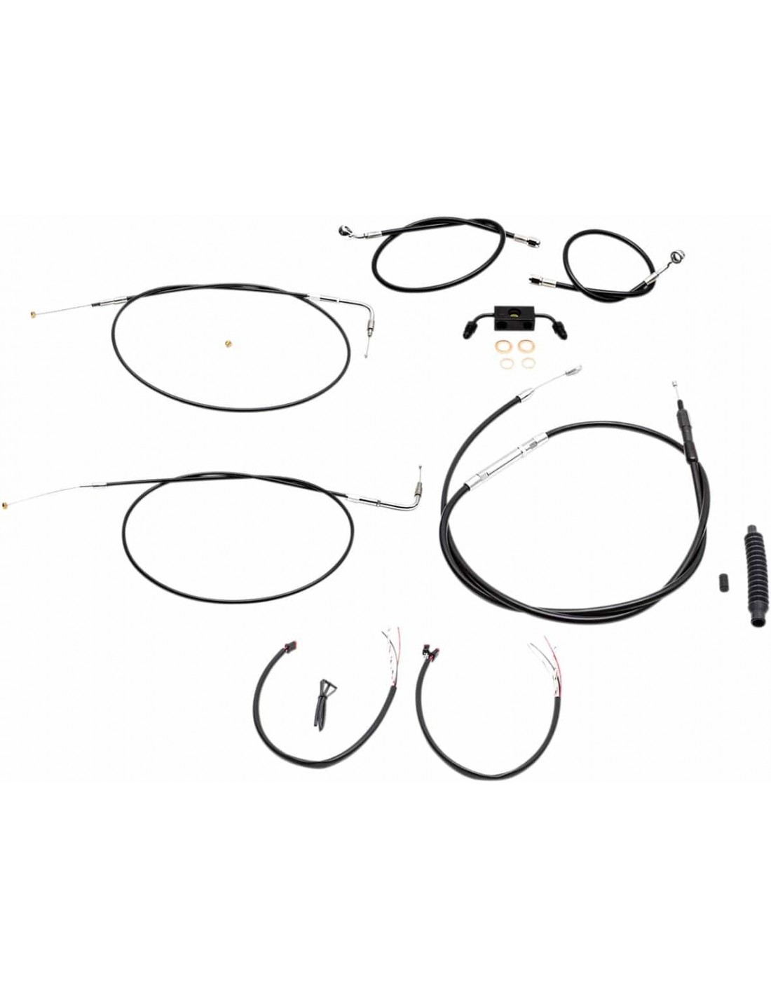 La ChoppersKit tubo freno/cavo manubrio completo intrecciato in vinile neroIl kit completo include tubi freno/frizione intrecciati della lunghezza corretta e prolunghe cavo per completare la sostituzione di un manubrio Il kit include giunto tubo freno a “T” cromato, viti banjo, raccordi e rondelle di tenuta in rame Made in USA Il kit si basa sull'utilizzo di riser da 2” con manubrio Ape Hanger