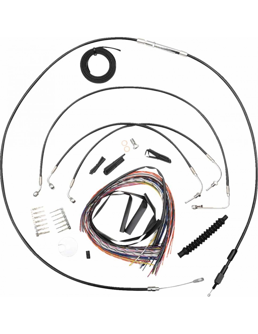 La ChoppersKit tubo freno/cavo manubrio completo intrecciato in vinile neroIl kit completo include tubi freno/frizione intrecciati della lunghezza corretta e prolunghe cavo per completare la sostituzione di un manubrio Il kit include giunto tubo freno a “T” cromato, viti banjo, raccordi e rondelle di tenuta in rame Made in USA Il kit si basa sull'utilizzo di riser da 2” con manubrio Ape Hanger