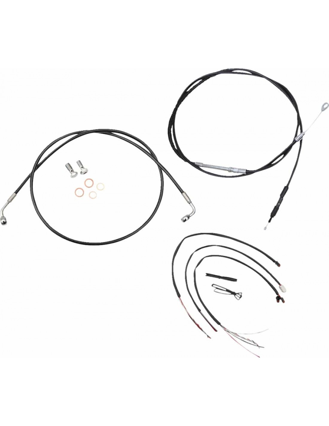 La ChoppersKit tubo freno/cavo manubrio completo intrecciato in vinile neroIl kit completo include tubi freno/frizione intrecciati della lunghezza corretta e prolunghe cavo per completare la sostituzione di un manubrio Il kit include giunto tubo freno a “T” cromato, viti banjo, raccordi e rondelle di tenuta in rame Made in USA Il kit si basa sull'utilizzo di riser da 2” con manubrio Ape Hanger