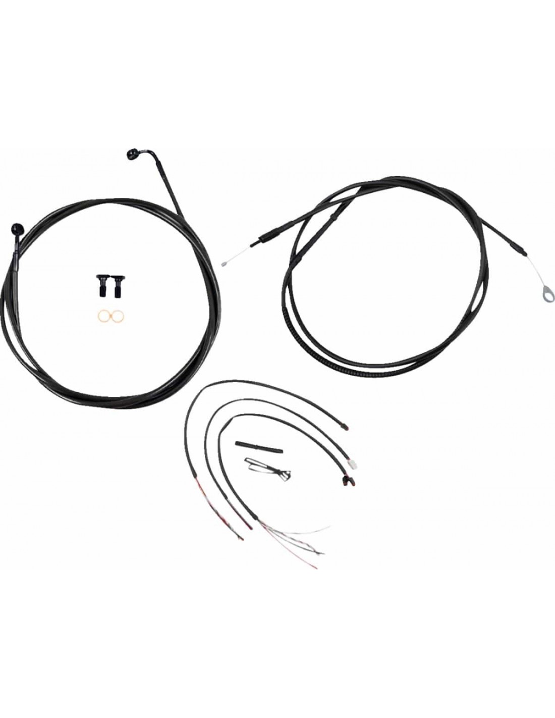 La ChoppersKit tubo freno/cavo manubrio completo intrecciato MidnightIl kit include tubi freno/frizione intrecciati della lunghezza corretta e prolunghe cavo per completare la sostituzione di un manubrio Il kit include giunto tubo freno a “T” nero, viti banjo, raccordi e rondelle di tenuta in rame Made in the USA Il kit si basa sull'utilizzo di riser da 2” con manubri Ape Hanger