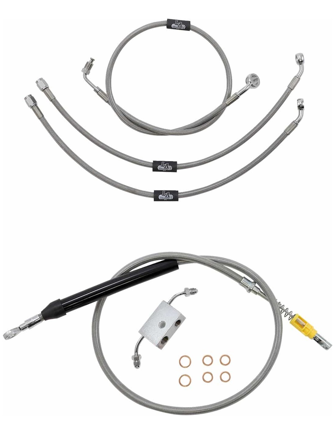 La ChoppersKit tubo freno/cavo manubrio intrecciato in acciaio inossidabile standardCon questo prodotto il calcolo dei cavi non rappresenterà più un problema Il kit standard include tubi freno/frizione della lunghezza corretta e prolunghe cavo per completare la sostituzione di un manubrio; prolunghe cavo elettrico non incluse (disponibili separatamente) Il kit standard include tubo frizione, tubi freno, giunto a T cromato per tubo freno, viti banjo, raccordi e rondelle di tenuta in rame Made in the USA Il kit si basa sull'utilizzo di riser da 2” con manubri Ape Hanger