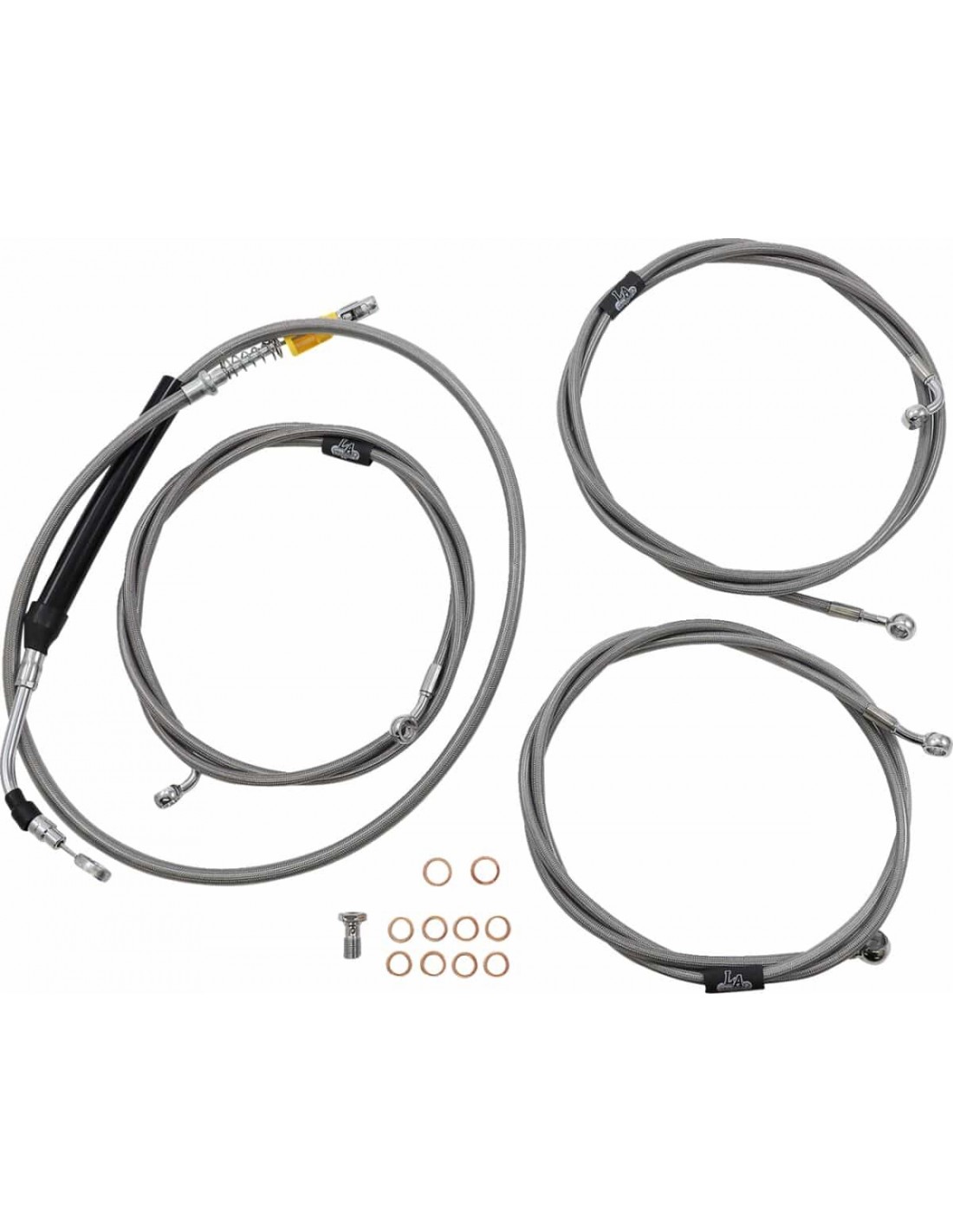 La ChoppersKit tubo freno/cavo manubrio intrecciato in acciaio inossidabile standardCon questo prodotto il calcolo dei cavi non rappresenterà più un problema Il kit standard include tubi freno/frizione della lunghezza corretta e prolunghe cavo per completare la sostituzione di un manubrio; prolunghe cavo elettrico non incluse (disponibili separatamente) Il kit standard include tubo frizione, tubi freno, giunto a T cromato per tubo freno, viti banjo, raccordi e rondelle di tenuta in rame Made in the USA Il kit si basa sull'utilizzo di riser da 2” con manubri Ape Hanger