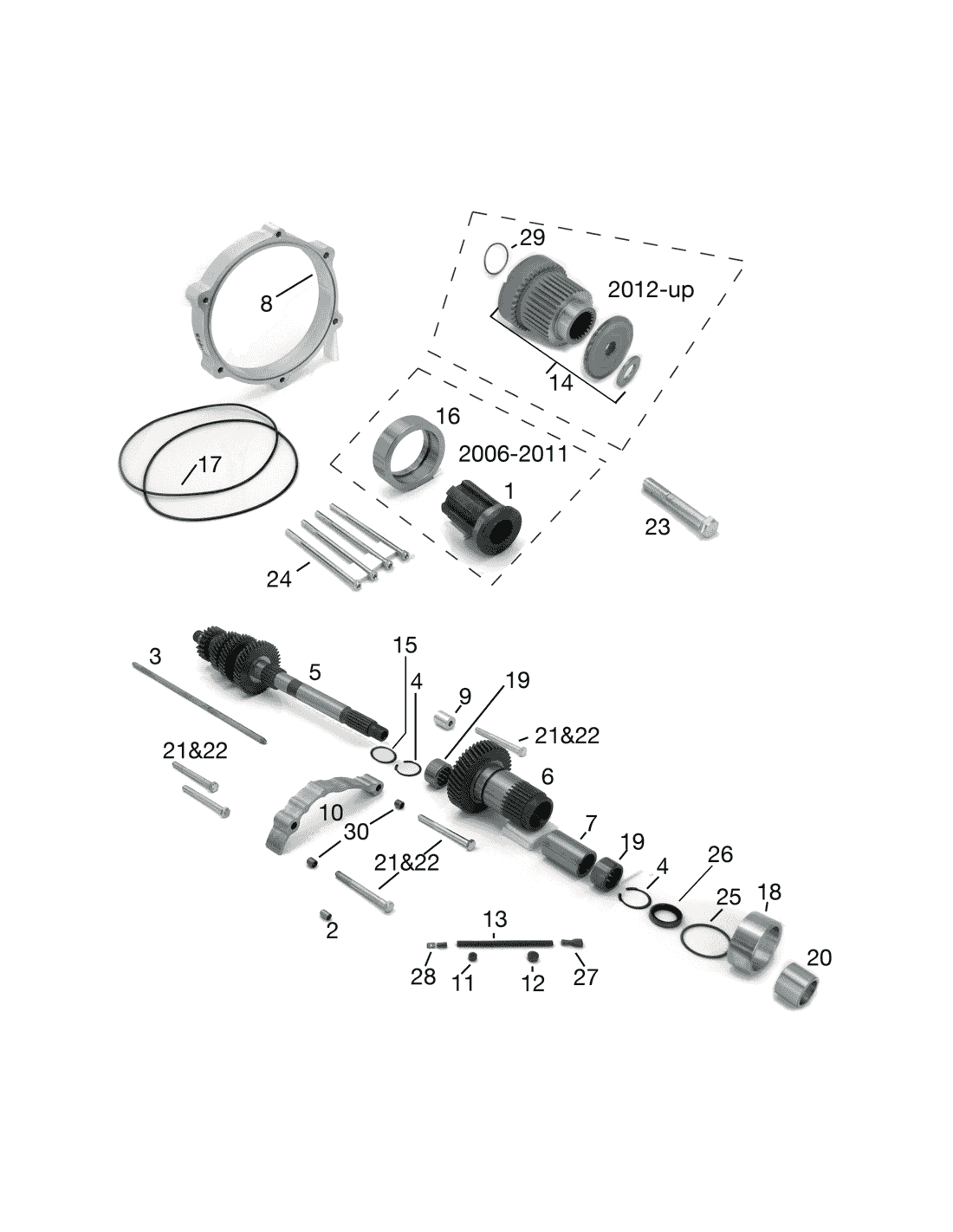 Nota: I Kit per i modelli 2012-2013 montano anche su modelli precedenti equipaggiati con compensatore Screamin' Eagle OEM 40274-08 o 40274-08A. Questo include solo una rondella di spinta tra il pignone e la ritenuta pignone. I kit per i modelli dal 2014 in poi montano anche su modelli precedenti equipaggiati con compensatore Screamin' Eagle OEM 36500034A, 40100061, 4220064, 4220064A, 42200095 or 42200095A. Questo include solo un cuscinetto di spinta e due rondelle di spinta tra il pignone e la ritenuta pignone.