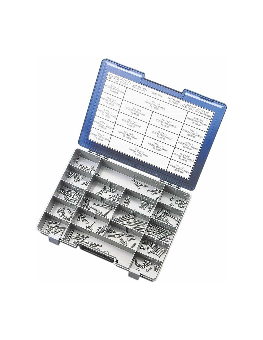 Drag SpecialtiesKit assortiti di viti n. 8 e 10 con filettatura a passo fine e grossoI kit contengono viti n. 8 e n. 10 con filettatura a passo fine e grosso in 18 misure diverse Made in the USA Kit completo