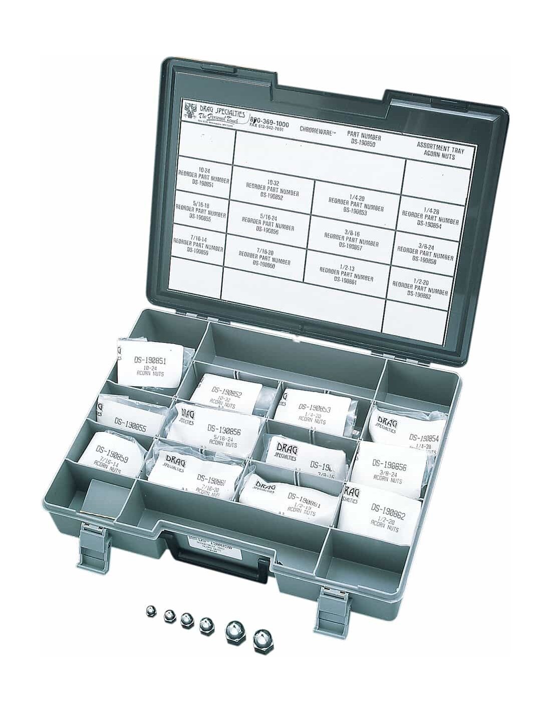Drag SpecialtiesKit assortimento di noci di ghiandaOgni misura contenuta nel kit può essere riordinata in confezioni da 10, eccetto le misure da 1/2" che sono confezioni da 5 L'assortimento completo presenta pregiate e filettature grosse, che vanno dalla dimensione #10 a 1/2" Viene fornito in una custodia di plastica con scomparti separati per ogni dado di dimensione Prodotto negli Stati Uniti br>