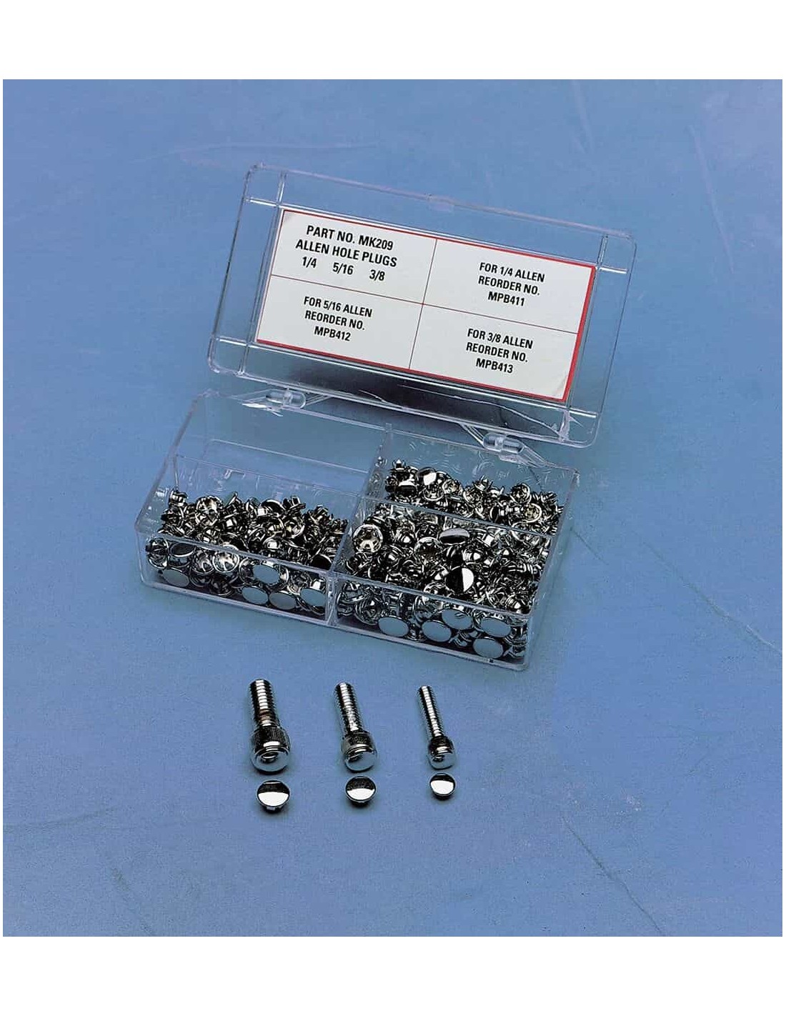 Drag SpecialtiesTappi terminali assortitiInclude una pratica cassetta con 100 tappi cromati per ciascuna delle seguenti misure: 1/4”, 5/16” e 3/8”; il kit include anche tre viti a brugola con tappo installato come campione di vendita Non cadono né si allentano come quelli di plastica o alluminio con o-ring Fissaggio saldo, consentono di dare quel tocco finale cromato sulla parte superiore della vite a brugola Made in USA
