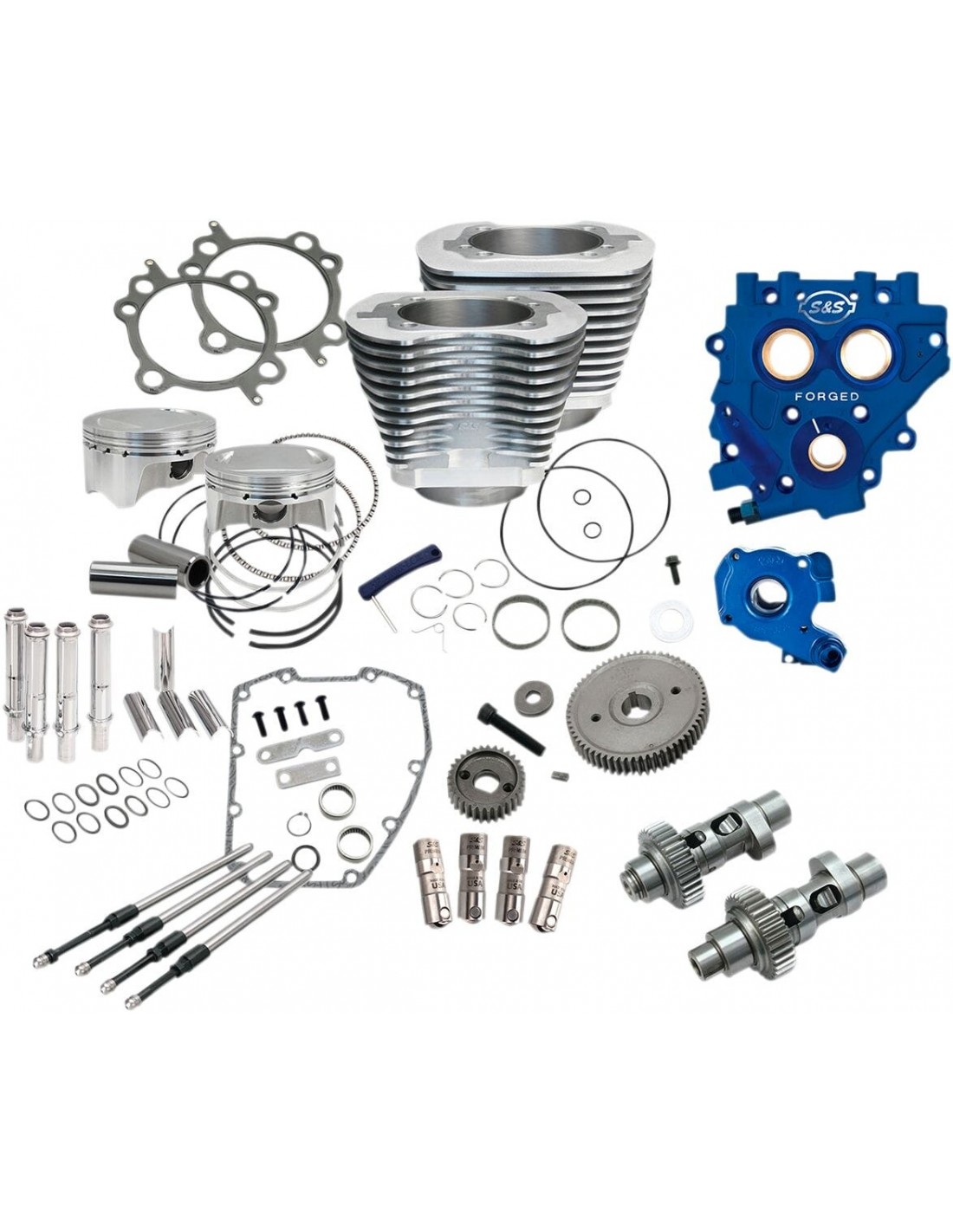 Kit aumento prestazioni 110"il cilindro è compatibile con i pistoni; nessuna lavorazione necessaria piastra di supporto camme tc3 e pompa dell'olio tc3 per garantire una pressione dell 'olio costante e longevità al motore include un kit cilindro big bore s&s 4”con pistoni 10.5:1, camme ad avviamento semplificato s&s 585, aste di spinta s&s quickee e punterie idrauliche di qualità superiore s&s per ottenere la massima cilindrata made in usa non adatto per utilizzo con teste s&s 79 cc utilizzabile con teste di serie