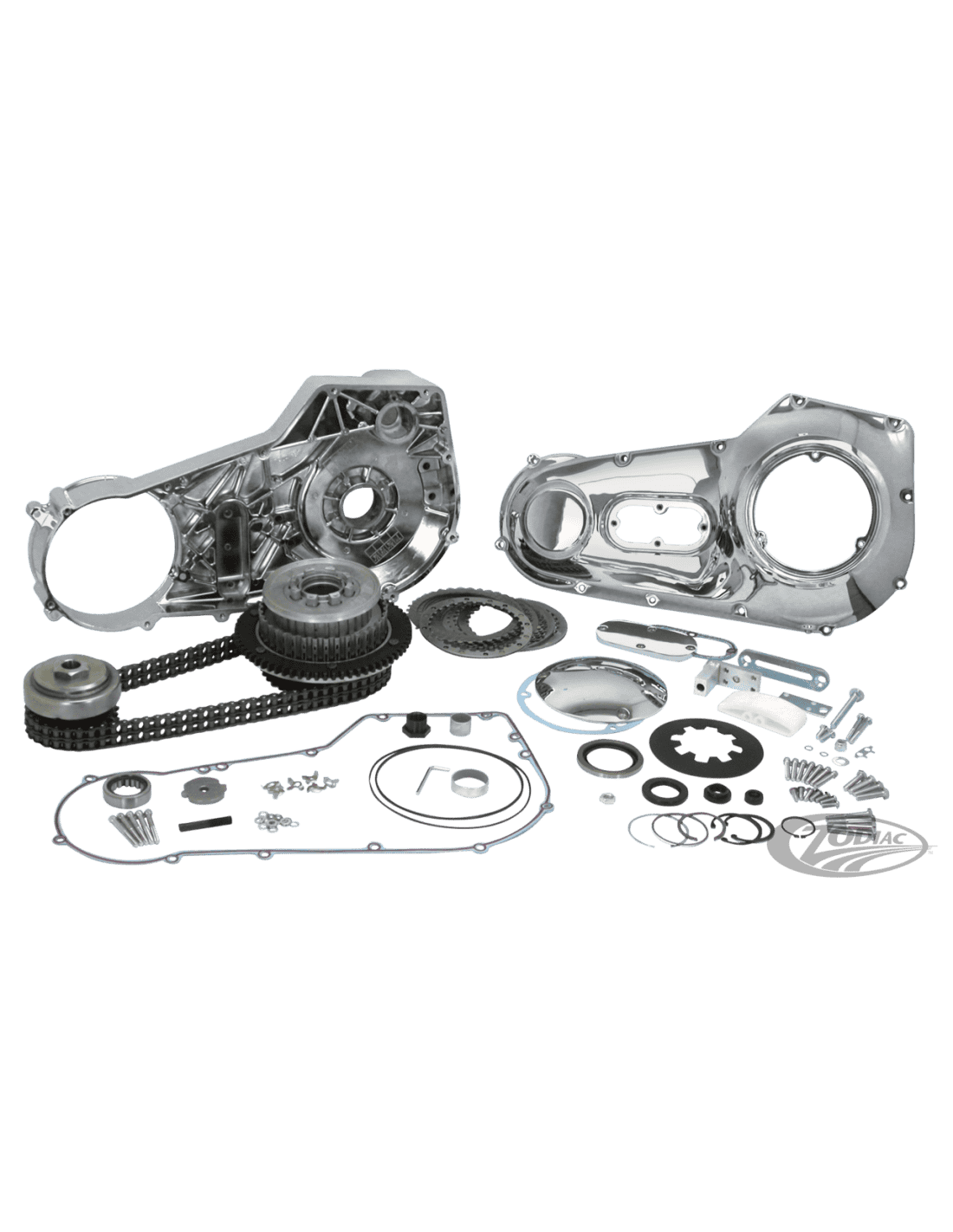 Zodiac (Genuine Zodiac Products)Come costruttore custom che costruisci moto intere sai benissimo quanto tempo bisogna spendere nel selezionare tutte le parti necessarie per avere una trasmissione primaria completa. Non più, adesso lo facciamo noi per te! Dovete solo selezionare il kit primario e la catena primaria a vostra scelta. Con questi kit primaria completi, in esclusiva dalla Zodiac, risparmierai molto tempo. Il kit primario contiene tutte le parti, minuteria e guarnizioni necessarie per una completa installazione. Sono inclusi: copertura primaria interna e copertura primaria esterna cromata, frizione completa, kit parastrappi, tendicatena e i coperchi d'ispezione. I kit sono disponibili per Softail dal 1990 al 2006 e tutte le moto custom tipo Softail con motore dal 1990 al 2006 con qualsiasi combinazione con cambio e motore d'avviamento.