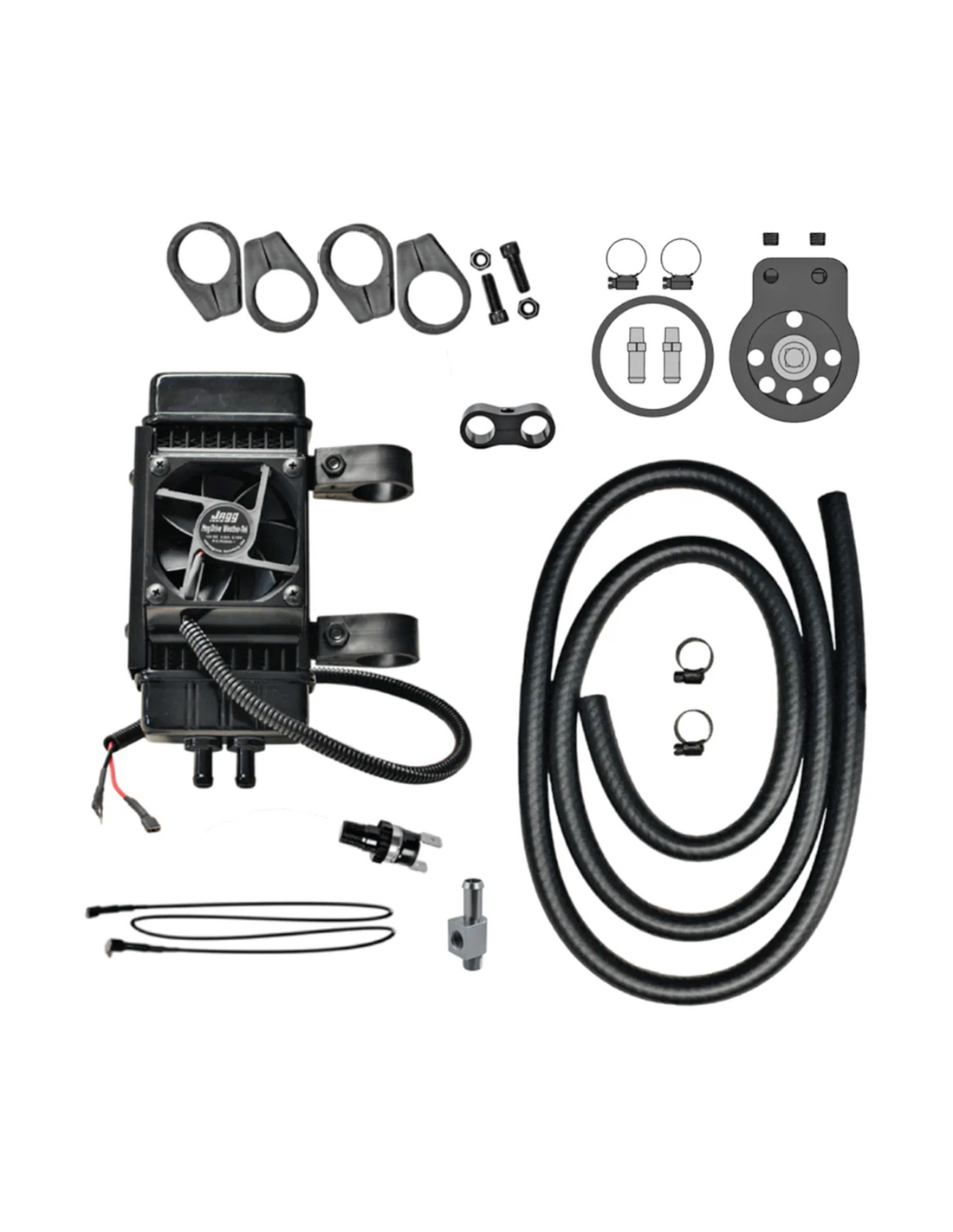 Jagg Oil CoolersPrestazioni superiori in una confezione compatta, il radiatore Jagg con ventola assistita è progettato per lavorare sia abasse velocità e nelle continue soste nel traffico che nei viaggi uin autostrada. Progettato per soddisfare la richiesta di raffreddamento dei motori V-Twin più recenti. Terminali lisci e una verniciatura nera lucida aiutano questo radiatore a mimetizzarsi nel telaio per un aspetto più pulito. Il radiatore è montato sul tubo sinistro del telaio e distanziato in maniera da permettere il flusso dell'aria sia al radiatore che al cilindro del motore. Il radiatore è montato sul telaio usando dei robusti supporti in Uralite dal look pulito e con caratteristiche ammortizzanti. Questo radiatore a 10 tubi offre una superficie di raffreddamento superiore rispetto alla concorrenza. La speciale valvola in linea aggiunge efficienza con una minima perdita di pressione e restrizione. In alluminio con finitura a polvere. La ventola Jagg WeatherTek, a prova di polvere ed impermeabile si aziona automaticamente a circa 100°C (210°F) a spinge 75cfm verso il radiatore. I kit sono forniti con l'adattore filtro olio Jagg a controllo termostatico che fornisce un facile accesso alla mandata dell'olio per l'installazione del radiatore. L'adattatore stile sandwich è ricavato da due pezzi di alluminio billet quindi anodizzato nero satinato. Si installa tra il filtro dell'olio e l'attacco del filtro dell'olio ed è progettato con la stessa tecnologia Hyper Flow di tutti i componenti Jagg. Il sistema di radiatore Jagg con ventola assistita è fornito completo con tutto il necessario per il montaggio e semplici istruzioni dettagliate.