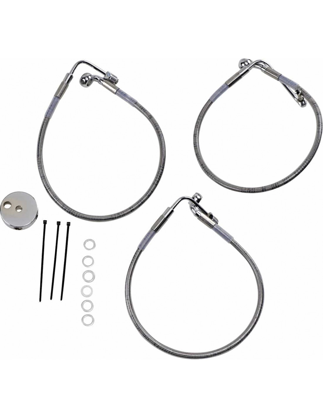 Drag SpecialtiesKit tubo freno in acciaio inossidabileTubi in acciaio inossidabile con rivestimento trasparente o in treccia metallica con rivestimento nero in vinile con raccordi in acciaio cromato Made in USA< /li>Kit tubo freno inferiore/superiore