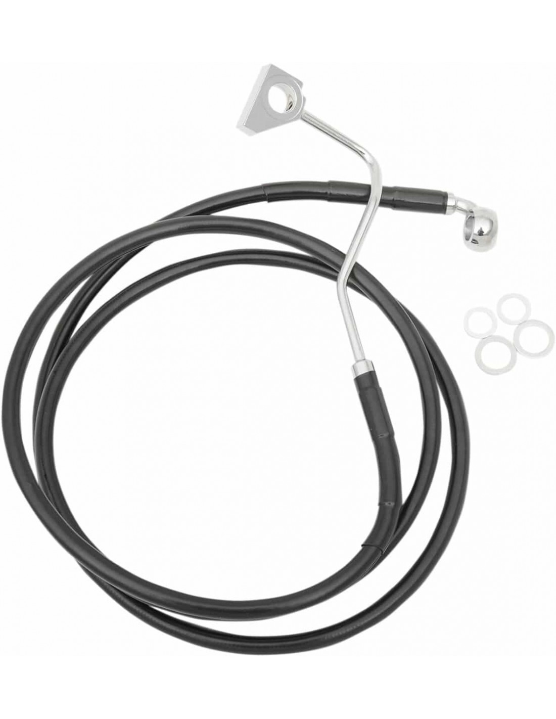 Drag SpecialtiesKit tubo freno in acciaio inossidabileTubi in acciaio inossidabile con rivestimento trasparente o in treccia metallica con rivestimento nero in vinile con raccordi in acciaio cromato Made in USA< /li>Kit tubo freno superiore