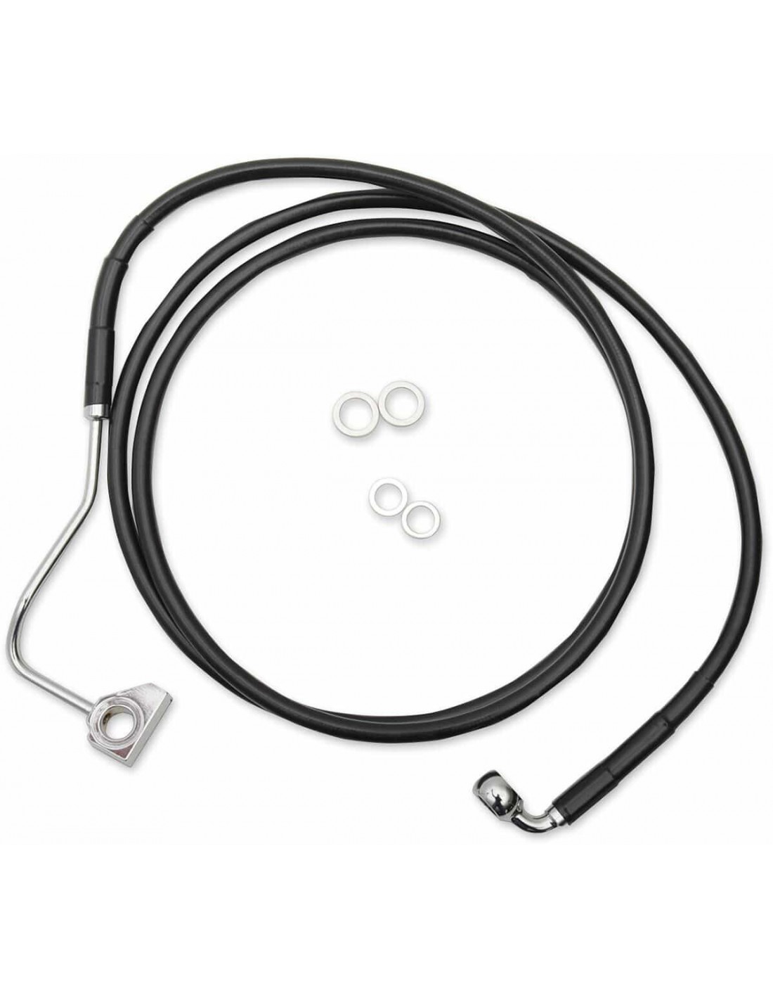 Drag SpecialtiesKit tubo freno in vinile nero a lunghezza maggiorataCon tubi più lunghi in treccia metallica con rivestimento nero in vinile con raccordi in acciaio cromato Made in the USA< /li> Tutte le misure sono approssimative Solo tubo freno superiore