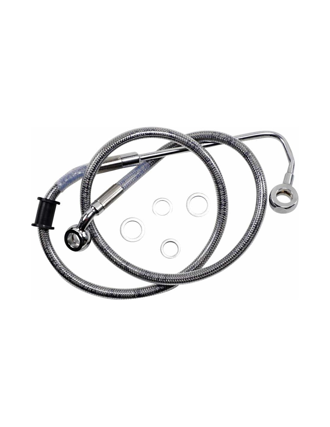 Drag SpecialtiesKit tubo freno in acciaio inossidabileTubi in acciaio inossidabile con rivestimento trasparente o in treccia metallica con rivestimento nero in vinile con raccordi in acciaio cromato Made in USA< /li>Solo tubo freno superiore