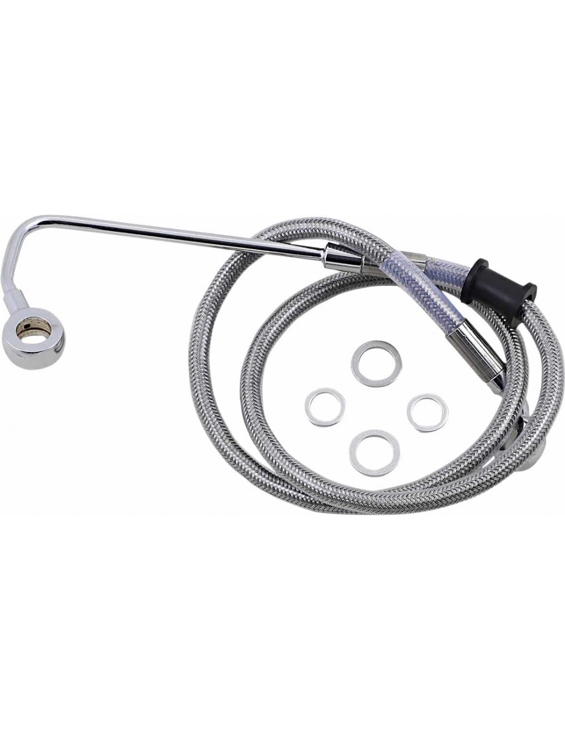 Drag SpecialtiesKit tubo freno in acciaio inossidabileTubi in acciaio inossidabile con rivestimento trasparente o in treccia metallica con rivestimento nero in vinile con raccordi in acciaio cromato Made in USA< /li>Solo tubo freno superiore