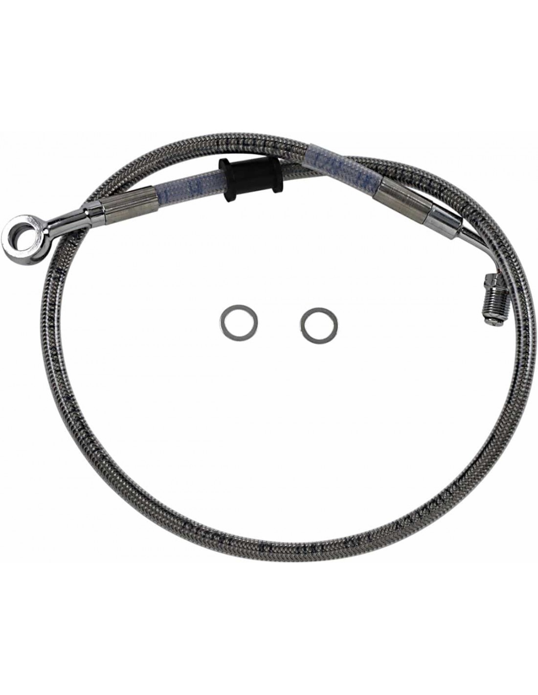 Drag SpecialtiesKit tubo freno in acciaio inossidabileTubi in acciaio inossidabile con rivestimento trasparente o in treccia metallica con rivestimento nero in vinile con raccordi in acciaio cromato Made in USA< /li>Solo tubo freno superiore