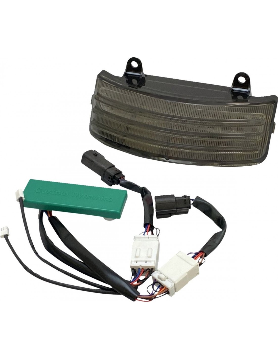 Custom DynamicsLuce posteriore led tribar a doppia intensitàunità di ricambio completa plug-and-play che contiene 48 led rossi a doppia intensità per le modalità di marcia e freno converte la luce di marcia tribar nella parte inferiore del parafango di serie in una luce di marcia e freno non compatibile con modelli internazionali o canadesi.
