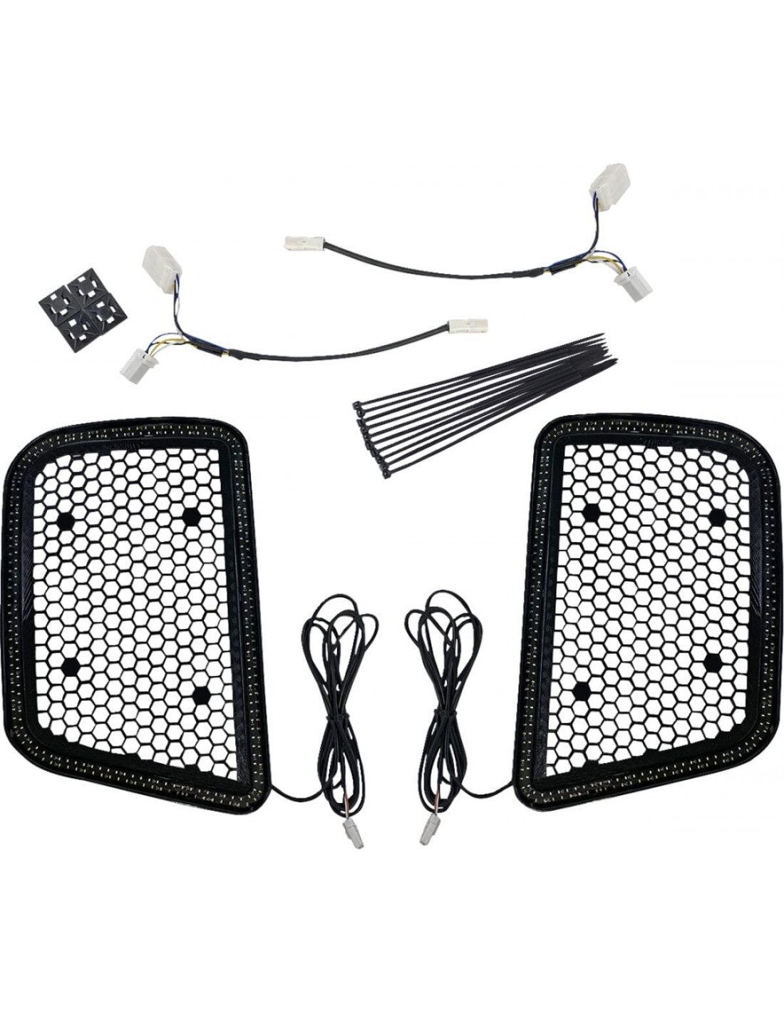 Custom DynamicsLuci dinamiche della carenatura inferiorele luci dinamiche della carenatura inferiore si fissano alle carenature inferiori oem harley davidson stile '05-'13 con nastro biadesivo il gruppo ha un nido d'ape griglia circondata da oltre 130 led chip-on-board bianchi e ambra le unità consentono di controllare il flusso d'aria aprendo o chiudendo il gruppo di ventilazione della carenatura oem cavo plug and play incluso il cablaggio si collega sotto la carenatura anteriore per alimentare la luce di marcia bianca brillante e gli indicatori di direzione ausiliari color ambra a contrasto completo