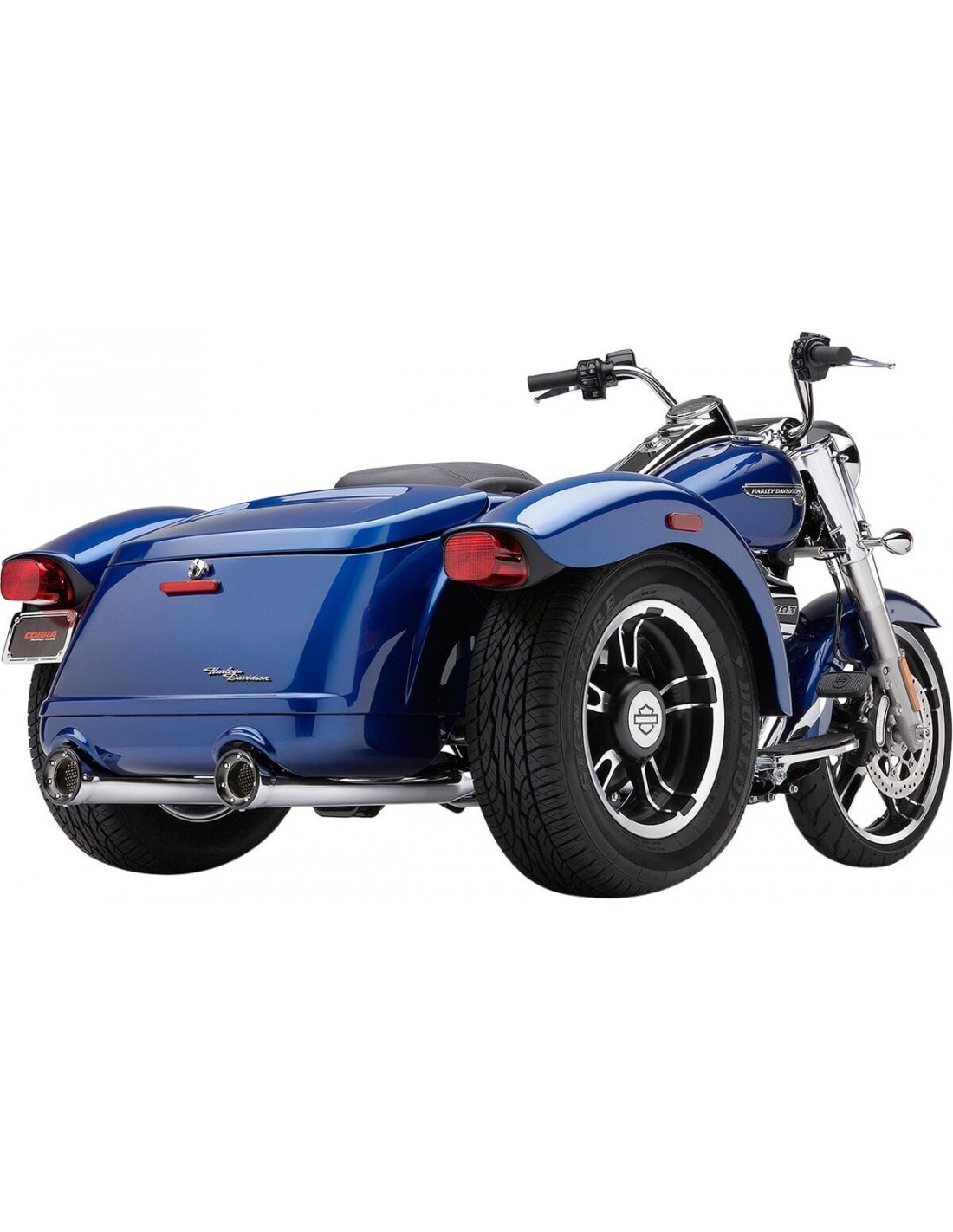 CobraSilenziatori slip-on rptspecificamente progettati per il modello harley-davidson freewheeler nonostante sia basato su tri-glide, freewheeler è almeno 3" più corto, facendo sì che i silenziatori bagger standard sporgano di 3" o 4" i silenziatori, se usati con collettori di serie, presentano un'installazione semplice i corpi silenziatori da 3,75 pollici terminano con una scampanatura di 4 pollici e sono rifiniti con race pro in alluminio fuso lavorato a macchina e verniciato a polvere di colore nero ogni fondello è fissato con sette viti da 12 punti, che si abbinano perfettamente allo stile aggressivo del freewheeler il corpo silenziatore è realizzato con all'interno un inserto perforato di 2,25" a flusso costante, avvolto da uno strato in fibra di vetro laminata a sua volta protetto da un secondo strato di fibra di vetro, per garantire il massimo delle prestazioni e