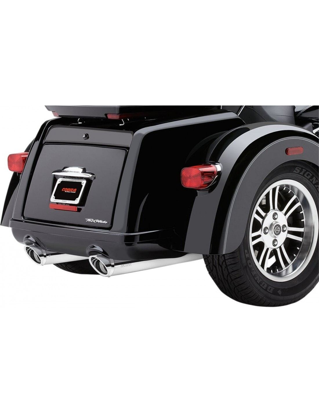 CobraSilenziatori tri glideprogettati appositamente per le trike grandi di harley i corpi silenziatore da 3,75" terminano con fondelli diagonali di 3" che si inseriscono nei corpi tramite una piccola ed elegante ghiera questa configurazione consente di tenere i fondelli cobra a una distanza dal terreno uguale o superiore a quella dell'impianto di serie il corpo silenziatore è realizzato con all' interno un inserto perforato di 2,5" a flusso costante, avvolto da uno strato in fibra di vetro laminata a sua volta protetto da un secondo strato di fibra di vetro, per garantire il massimo delle prestazioni e u offre prestazioni straordinarie con un suono roboante e baritonale made in usa