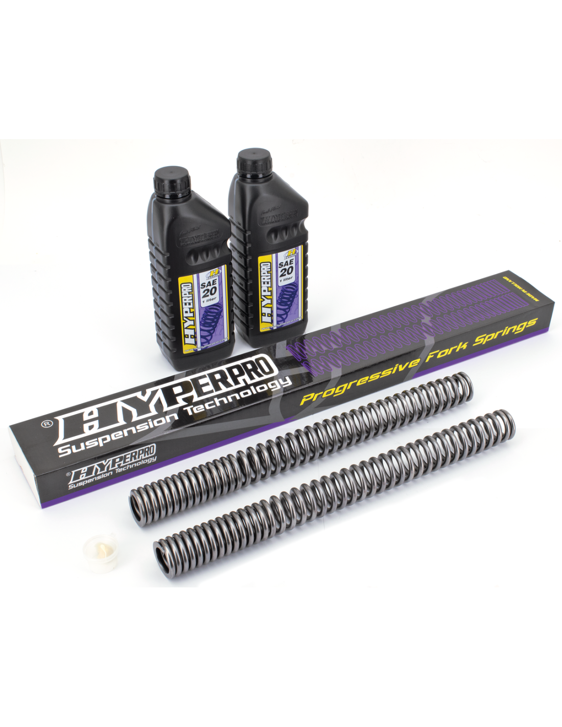 Hyperpro ha dedicato anni di ricerca e sviluppo a forcelle, ammortizzatori, molle e sistemi di sospensione anteriori. Poiché nella maggior parte dei casi una molla lineare è troppo dura o troppo morbida all'inizio e/o alla fine, una cosiddetta molla progressiva a un passo rappresenta un miglioramento, ma è ancora un compromesso tra comfort e sicurezza. Il passaggio improvviso da morbido a duro è spesso percepito come uno svantaggio e può portare a "oscillazioni di velocità". Hyperpro ha proposto una soluzione senza compromessi: il "Link-System Curve Design" per le molle. Grazie a questa struttura, una molla può essere progettata per soddisfare tutte le esigenze della moderna tecnologia motociclistica. Hyperpro offre una parte iniziale sensibile della corsa con un tasso di molla che aumenta dolcemente per garantire la sicurezza e l'anti-dive a fine corsa. L'uso di materiali di altissima qualità e la precisione della lavorazione danno vita alle migliori molle che si possano acquistare. Le molle della forcella sono prodotte in conformità alla norma DIN-2095, classe 1, sono appositamente lucidate per ridurre al minimo l'attrito e hanno una garanzia a vita contro la rottura. Le molle degli ammortizzatori garantiscono una tenuta di strada e una maneggevolezza superiori in tutte le condizioni e sono accuratamente testate su un banco di prova computerizzato e sulla moto in questione. Sono disponibili con superficie in poliestere nera o viola e con gli stessi standard tecnici delle molle della forcella. I kit forcella anteriori sono completi di molle, un litro di liquido per sospensioni Hyperpro, un tubetto di lubrificante per guarnizioni forcella Hyperpro e un manuale professionale con consigli sulle sospensioni.