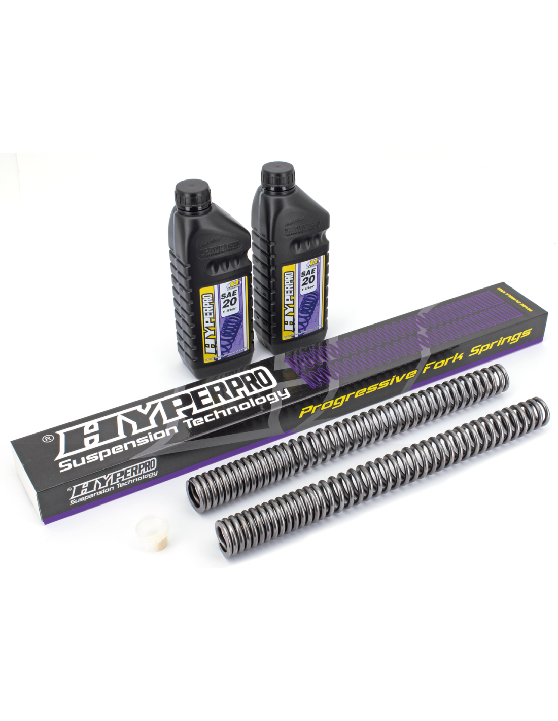 Hyperpro ha dedicato anni di ricerca e sviluppo a forcelle, ammortizzatori, molle e sistemi di sospensione anteriori. Poiché nella maggior parte dei casi una molla lineare è troppo dura o troppo morbida all'inizio e/o alla fine, una cosiddetta molla progressiva a un passo rappresenta un miglioramento, ma è ancora un compromesso tra comfort e sicurezza. Il passaggio improvviso da morbido a duro è spesso percepito come uno svantaggio e può portare a "oscillazioni di velocità". Hyperpro ha proposto una soluzione senza compromessi: il "Link-System Curve Design" per le molle. Grazie a questa struttura, una molla può essere progettata per soddisfare tutte le esigenze della moderna tecnologia motociclistica. Hyperpro offre una parte iniziale sensibile della corsa con un tasso di molla che aumenta dolcemente per garantire la sicurezza e l'anti-dive a fine corsa. L'uso di materiali di altissima qualità e la precisione della lavorazione danno vita alle migliori molle che si possano acquistare. Le molle della forcella sono prodotte in conformità alla norma DIN-2095, classe 1, sono appositamente lucidate per ridurre al minimo l'attrito e hanno una garanzia a vita contro la rottura. Le molle degli ammortizzatori garantiscono una tenuta di strada e una maneggevolezza superiori in tutte le condizioni e sono accuratamente testate su un banco di prova computerizzato e sulla moto in questione. Sono disponibili con superficie in poliestere nera o viola e con gli stessi standard tecnici delle molle della forcella. I kit forcella anteriori sono completi di molle, un litro di liquido per sospensioni Hyperpro, un tubetto di lubrificante per guarnizioni forcella Hyperpro e un manuale professionale con consigli sulle sospensioni.