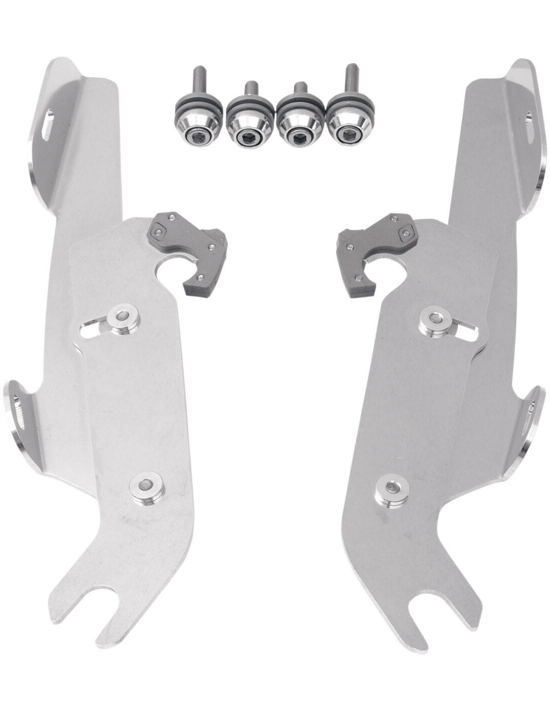 Kit di montaggio completo a sgancio rapido fats/slimangolazione regolabile installazione semplice e specifica per il modello, senza ricorrere ad attrezzi di montaggio/smontaggio una coppia di agganci in nylon rinforzato con fibra di vetro lo blocca fino a quando gli attacchi a sgancio rapido con molla non vengono disinseriti intenzionalmente esclusivamente in alluminio galvanizzato e acciaio inossidabile, con elementi di fissaggio in acciaio inossidabile il materiale per l'ancoraggio è identico per tutti i parabrezza e la cura della natura di ogni moto made in the usa - made in memphis! per l'utilizzo con barra luci oem