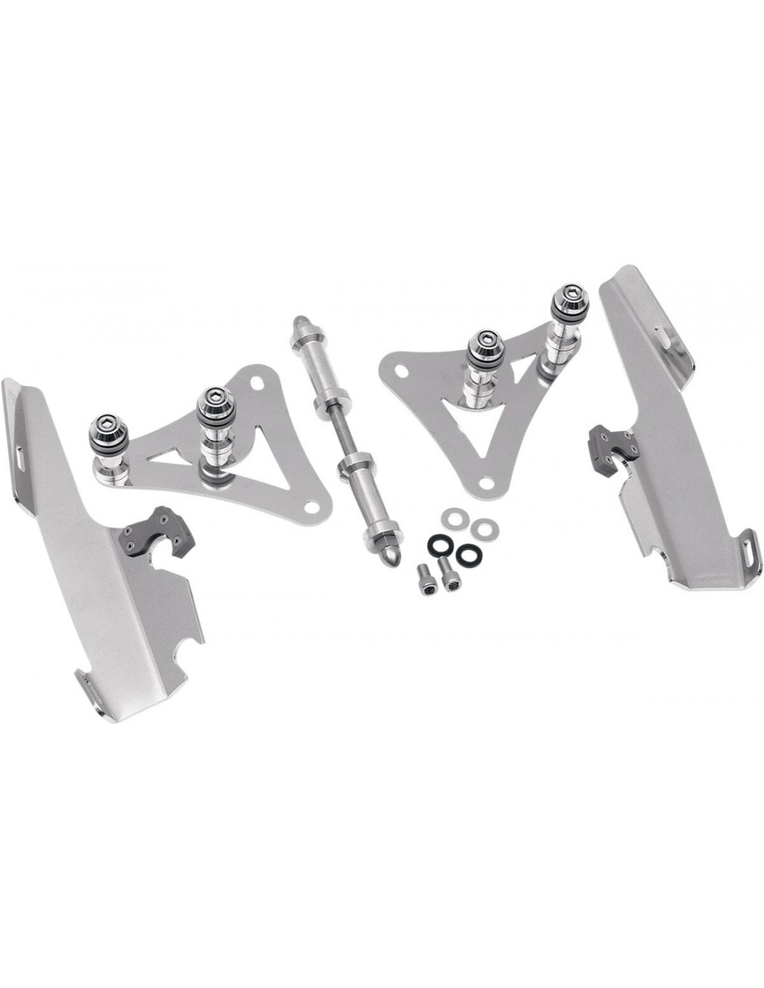 Memphis Shades HdKit di montaggio completo a sgancio rapido fats/slimangolazione regolabile installazione semplice e specifica per il modello, senza ricorrere ad attrezzi di montaggio/smontaggio una coppia di agganci in nylon rinforzato con fibra di vetro lo blocca fino a quando gli attacchi a sgancio rapido con molla non vengono disinseriti intenzionalmente esclusivamente in alluminio galvanizzato e acciaio inossidabile, con elementi di fissaggio in acciaio inossidabile il materiale per l'ancoraggio è identico per tutti i parabrezza e la cura della natura di ogni moto made in the usa - made in memphis! la barra luci deve essere di tipo curvo per consentire l'installazione della vite superiore e delle boccole di supporto
