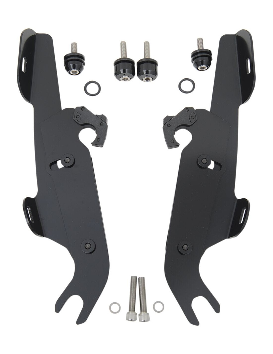 Kit di montaggio completo a sgancio rapido fats/slimangolazione regolabile installazione semplice e specifica per il modello, senza ricorrere ad attrezzi di montaggio/smontaggio una coppia di agganci in nylon rinforzato con fibra di vetro lo blocca fino a quando gli attacchi a sgancio rapido con molla non vengono disinseriti intenzionalmente esclusivamente in alluminio galvanizzato e acciaio inossidabile, con elementi di fissaggio in acciaio inossidabile il materiale per l'ancoraggio è identico per tutti i parabrezza e la cura della natura di ogni moto made in the usa - made in memphis! gli indicatori di direzione montati sul manubrio possono richiedere il kit di riposizionamento indicatori di direzione, cod. 2321-0088