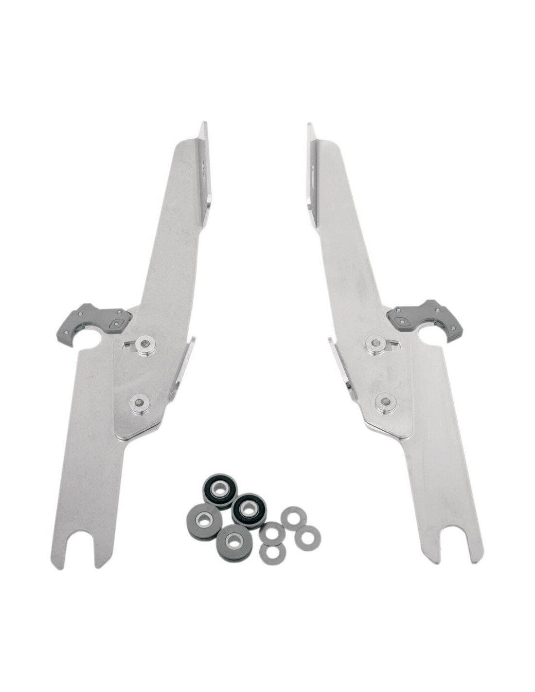 Memphis Shades HdKit di montaggio completo a sgancio rapido fats/slimangolazione regolabile installazione semplice e specifica per il modello, senza ricorrere ad attrezzi di montaggio/smontaggio una coppia di agganci in nylon rinforzato con fibra di vetro lo blocca fino a quando gli attacchi a sgancio rapido con molla non vengono disinseriti intenzionalmente esclusivamente in alluminio galvanizzato e acciaio inossidabile, con elementi di fissaggio in acciaio inossidabile il materiale per l'ancoraggio è identico per tutti i parabrezza e la cura della natura di ogni moto made in the usa - made in memphis! angolo regolabile
