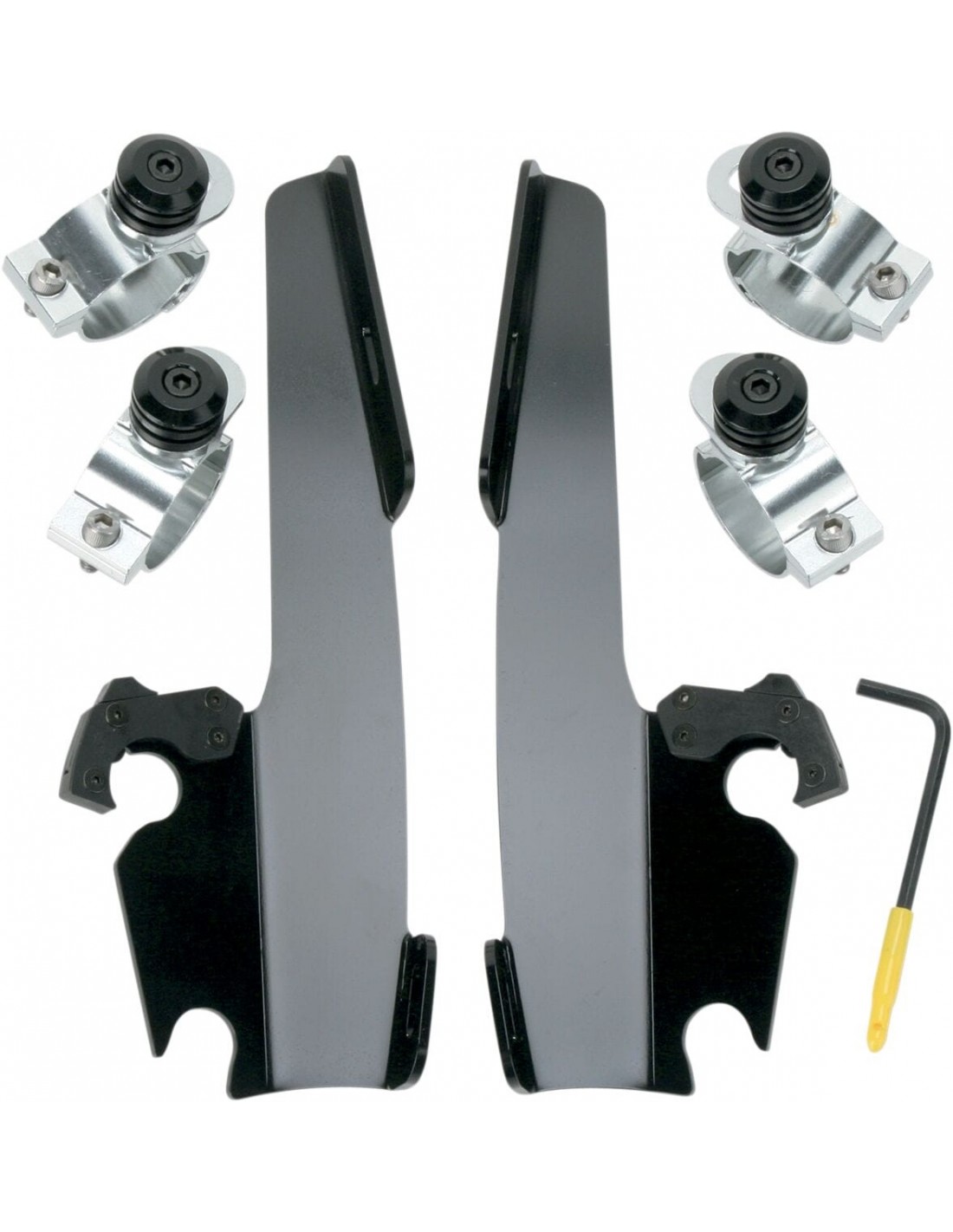 Kit di montaggio completo a sgancio rapido fats/slimangolazione regolabile installazione semplice e specifica per il modello, senza ricorrere ad attrezzi di montaggio/smontaggio una coppia di agganci in nylon rinforzato con fibra di vetro lo blocca fino a quando gli attacchi a sgancio rapido con molla non vengono disinseriti intenzionalmente esclusivamente in alluminio galvanizzato e acciaio inossidabile, con elementi di fissaggio in acciaio inossidabile il materiale per l'ancoraggio è identico per tutti i parabrezza e la cura della natura di ogni moto made in the usa - made in memphis!
