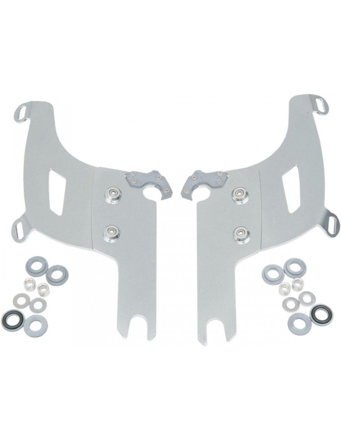 Memphis Shades HdKit materiale di montaggio a sgancio rapido per carenatura bulletangolazione regolabile installazione specifica e semplice per il modello, senza ricorrere ad attrezzi di montaggio/smontaggio una coppia di agganci in fibra di vetro e nylon lo blocca fino a quando gli attacchi a sgancio rapido con molla non vengono disinseriti intenzionalmente •esclusivamente in alluminio elettro-rivestito e acciaio inossidabile, con elementi di fissaggio in acciaio inossidabile. il materiale per il montaggio di ancoraggio è identico per tutti i parabrezza e le carenature di ciascuna moto made in the usa - made in memphis! flhrs/flhrsi richiedono il materiale per il montaggio per il parabrezza oem flhr