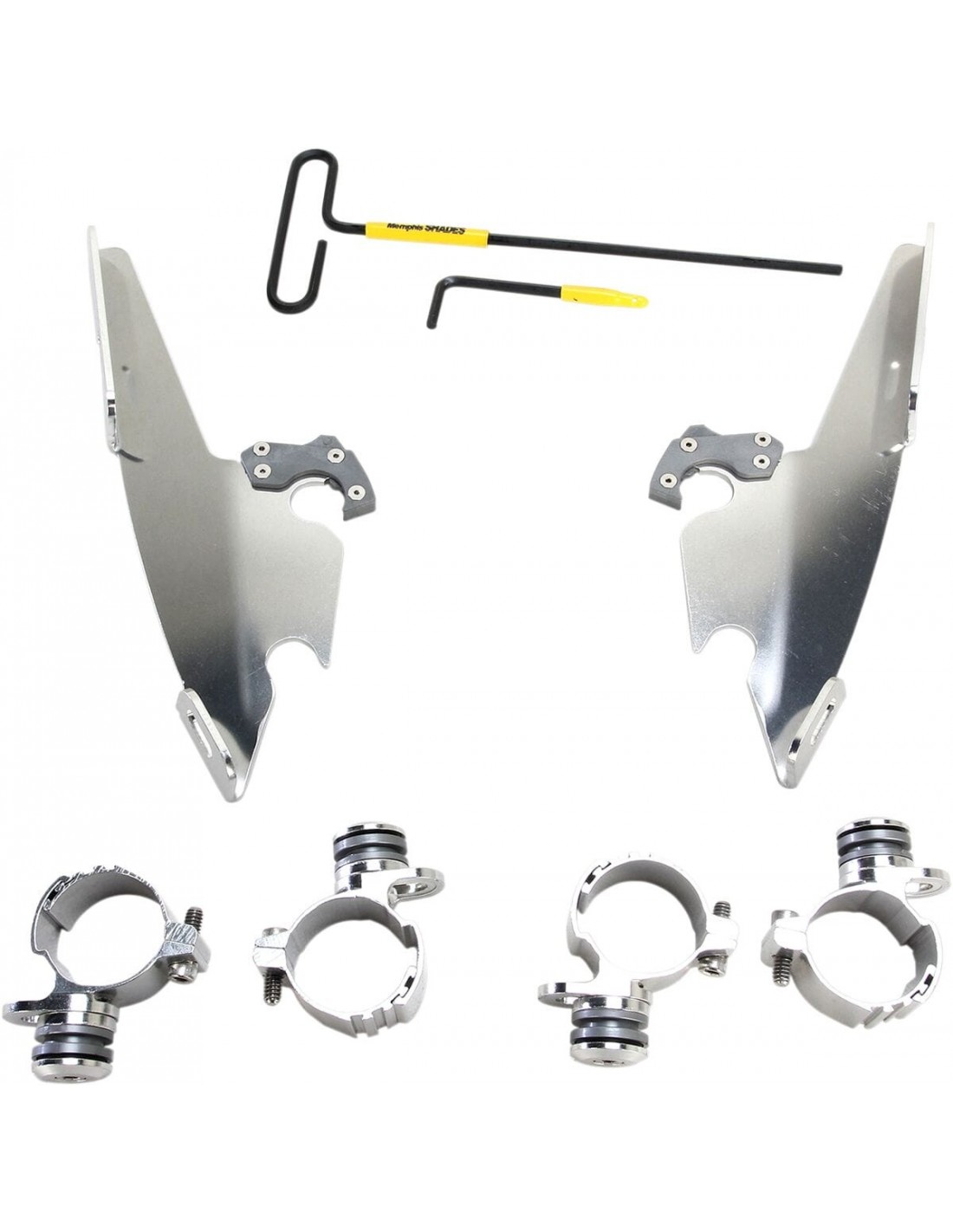 Memphis Shades HdKit di montaggio completo a sgancio rapido fats/slimangolazione regolabile installazione semplice e specifica per il modello, senza ricorrere ad attrezzi di montaggio/smontaggio una coppia di agganci in nylon rinforzato con fibra di vetro lo blocca fino a quando gli attacchi a sgancio rapido con molla non vengono disinseriti intenzionalmente esclusivamente in alluminio galvanizzato e acciaio inossidabile, con elementi di fissaggio in acciaio inossidabile il materiale per l'ancoraggio è identico per tutti i parabrezza e la cura della natura di ogni moto made in the usa - made in memphis!