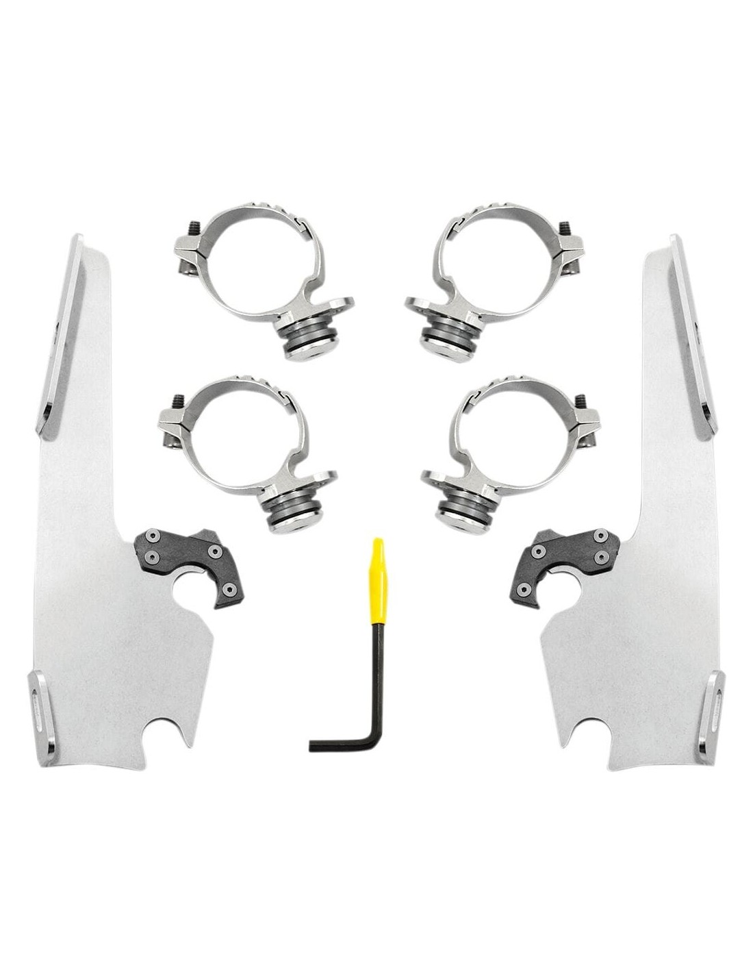 Memphis Shades HdKit di montaggio completo a sgancio rapido fats/slimangolazione regolabile installazione semplice e specifica per il modello, senza ricorrere ad attrezzi di montaggio/smontaggio una coppia di agganci in nylon rinforzato con fibra di vetro lo blocca fino a quando gli attacchi a sgancio rapido con molla non vengono disinseriti intenzionalmente esclusivamente in alluminio galvanizzato e acciaio inossidabile, con elementi di fissaggio in acciaio inossidabile il materiale per l'ancoraggio è identico per tutti i parabrezza e la cura della natura di ogni moto made in the usa - made in memphis!