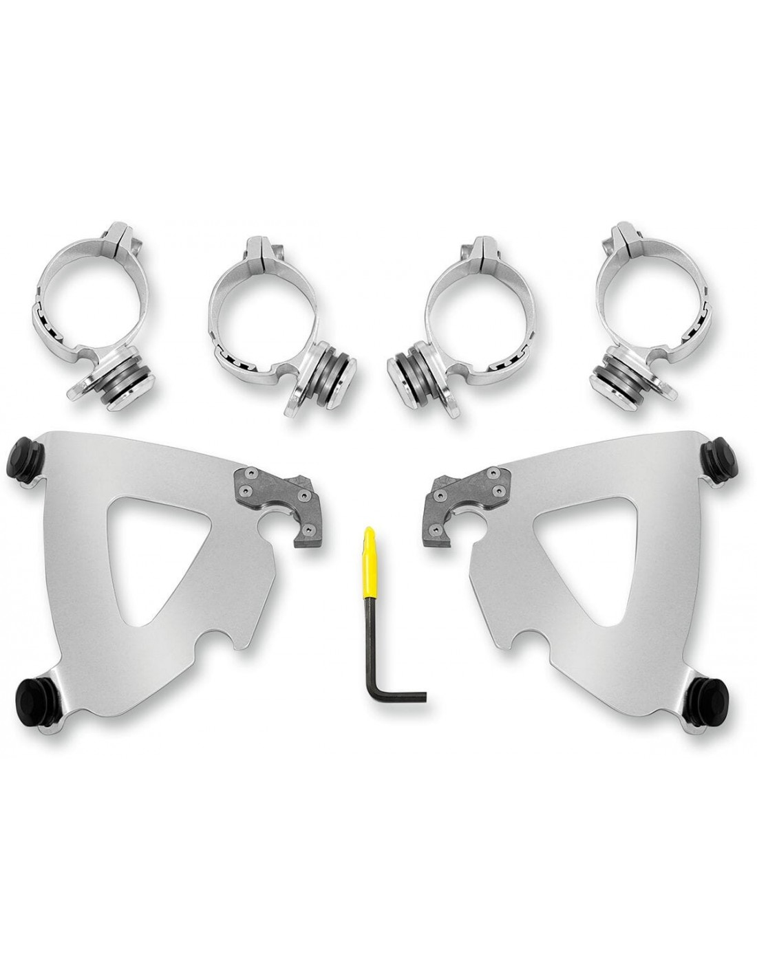 Kit di montaggio a sgancio rapido road warriorangolazione regolabile installazione specifica e semplice per il modello, senza ricorrere ad attrezzi di montaggio/smontaggio una coppia di agganci in fibra di vetro e nylon lo blocca fino a quando gli attacchi a sgancio rapido con molla non vengono disinseriti intenzionalmente esclusivamente in alluminio galvanizzato e acciaio inossidabile, con elementi di fissaggio in acciaio inossidabile il materiale per il montaggio di ancoraggio è identico per tutti i parabrezza e le carenature di ciascuna moto made in the usa - made in memphis! le applicazioni fxbb/fxst richiedono il codice del blocco faro n. 2001-1763.