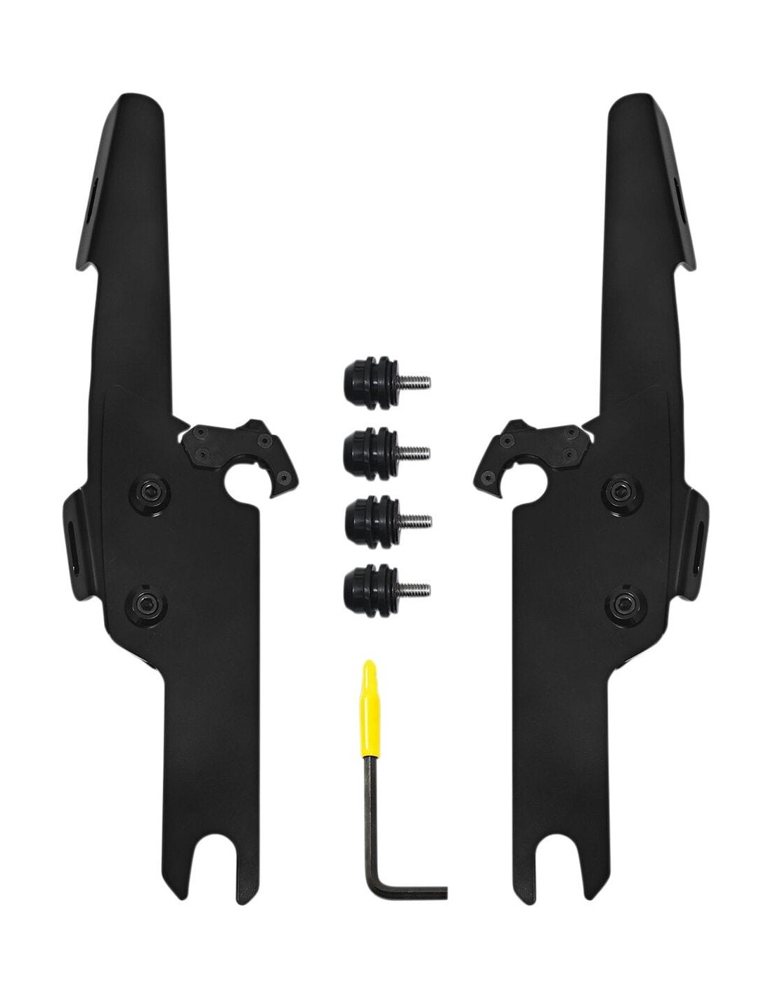 Memphis Shades HdKit di montaggio completo a sgancio rapido fats/slimangolazione regolabile installazione semplice e specifica per il modello, senza ricorrere ad attrezzi di montaggio/smontaggio una coppia di agganci in nylon rinforzato con fibra di vetro lo blocca fino a quando gli attacchi a sgancio rapido con molla non vengono disinseriti intenzionalmente esclusivamente in alluminio galvanizzato e acciaio inossidabile, con elementi di fissaggio in acciaio inossidabile il materiale per l'ancoraggio è identico per tutti i parabrezza e la cura della natura di ogni moto made in the usa - made in memphis!