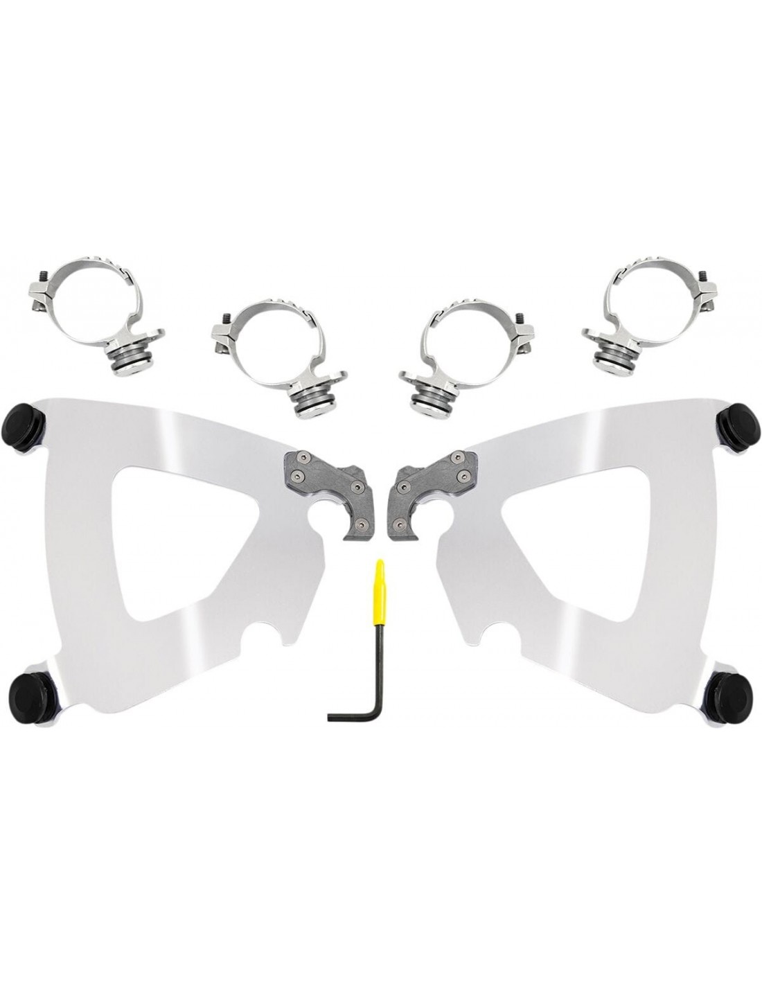 Memphis Shades HdKit di montaggio a sgancio rapido road warriorangolazione regolabile installazione specifica e semplice per il modello, senza ricorrere ad attrezzi di montaggio/smontaggio una coppia di agganci in fibra di vetro e nylon lo blocca fino a quando gli attacchi a sgancio rapido con molla non vengono disinseriti intenzionalmente esclusivamente in alluminio galvanizzato e acciaio inossidabile, con elementi di fissaggio in acciaio inossidabile il materiale per il montaggio di ancoraggio è identico per tutti i parabrezza e le carenature di ciascuna moto made in the usa - made in memphis! richiede kit di estensione faro - lungo - #mek9896 (lucido) o #meb9896 (nero). Richiede lo spostamento degli indicatori di direzione anteriori. Consigliato #meb9992