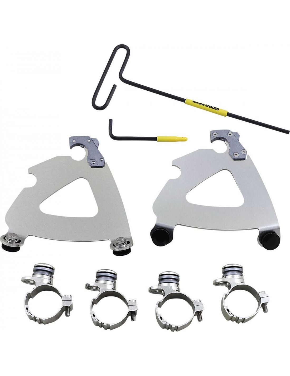 Memphis Shades HdKit di montaggio a sgancio rapido road warriorangolazione regolabile installazione specifica e semplice per il modello, senza ricorrere ad attrezzi di montaggio/smontaggio una coppia di agganci in fibra di vetro e nylon lo blocca fino a quando gli attacchi a sgancio rapido con molla non vengono disinseriti intenzionalmente esclusivamente in alluminio galvanizzato e acciaio inossidabile, con elementi di fissaggio in acciaio inossidabile il materiale per il montaggio di ancoraggio è identico per tutti i parabrezza e le carenature di ciascuna moto made in the usa - made in memphis!